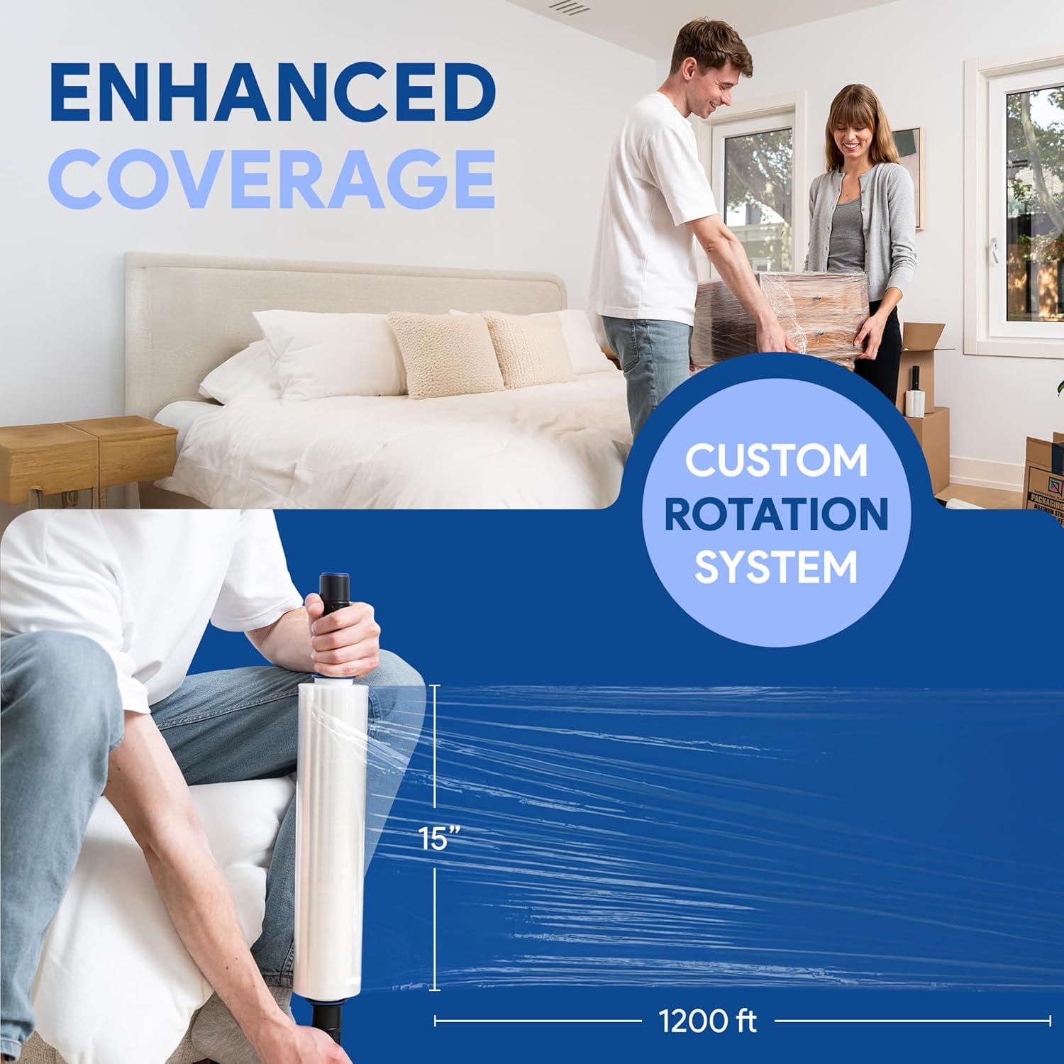 - CONQUER MOVING DAY: Wrap, bundle, and secure all your belongings with ease using this 15" x 1200 ft stretch film with extended tension handles. Move with confidence knowing your items are protected!