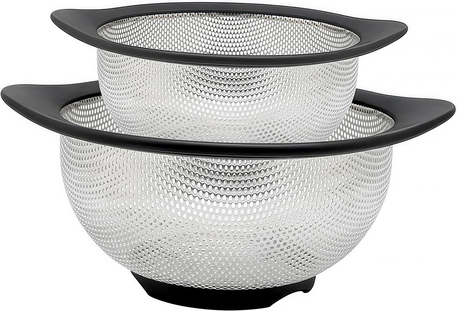 Stainless Steel Colander for Kitchen Metal Colanders & Food Strainers, Small and Large Sink Colander Set, Black Non-Slip Grip, (3 QT and 5 QT)