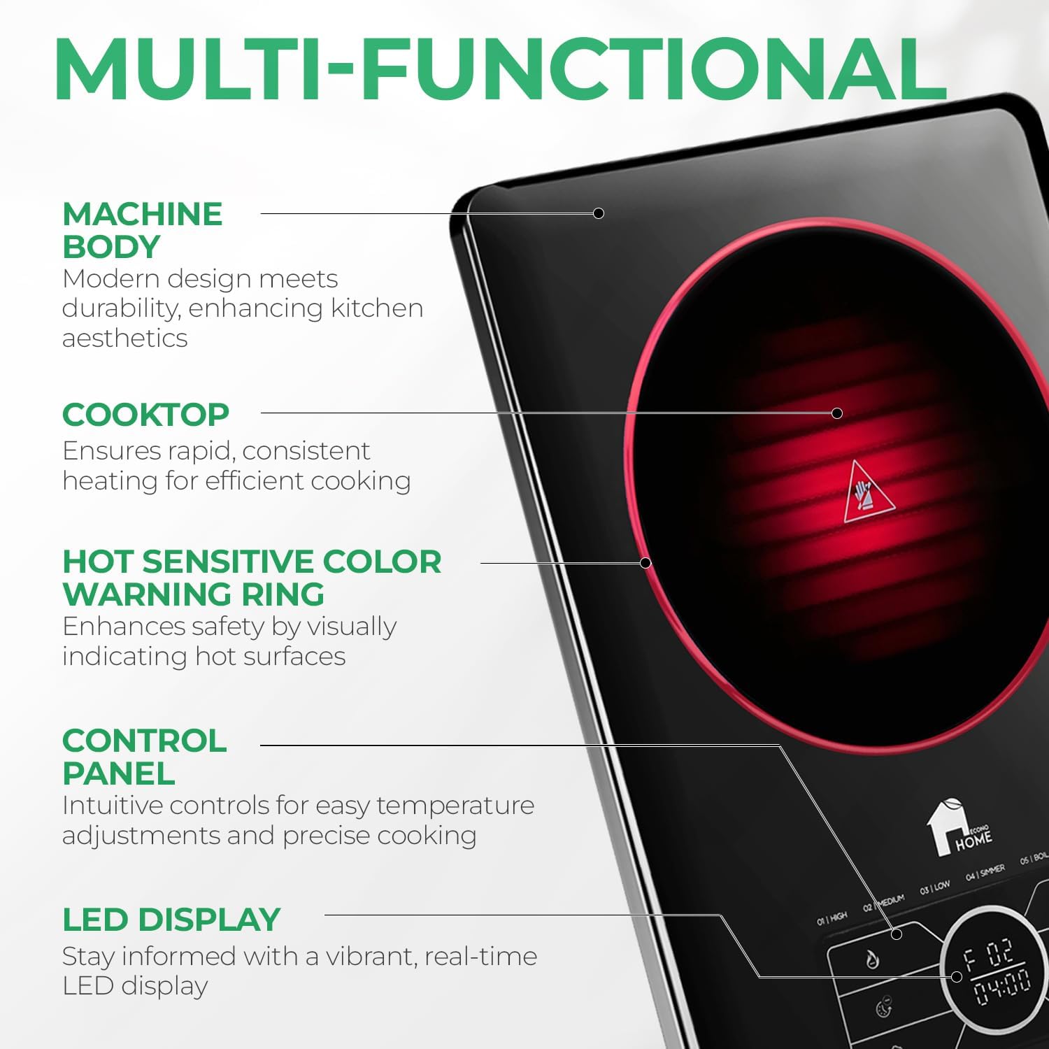 - Places Safety First - Experience confident and worry-free cooking. Our portable stove top's hot-sensitive color warning ring ensures safety by turning red when the temperature surpasses 65°C.