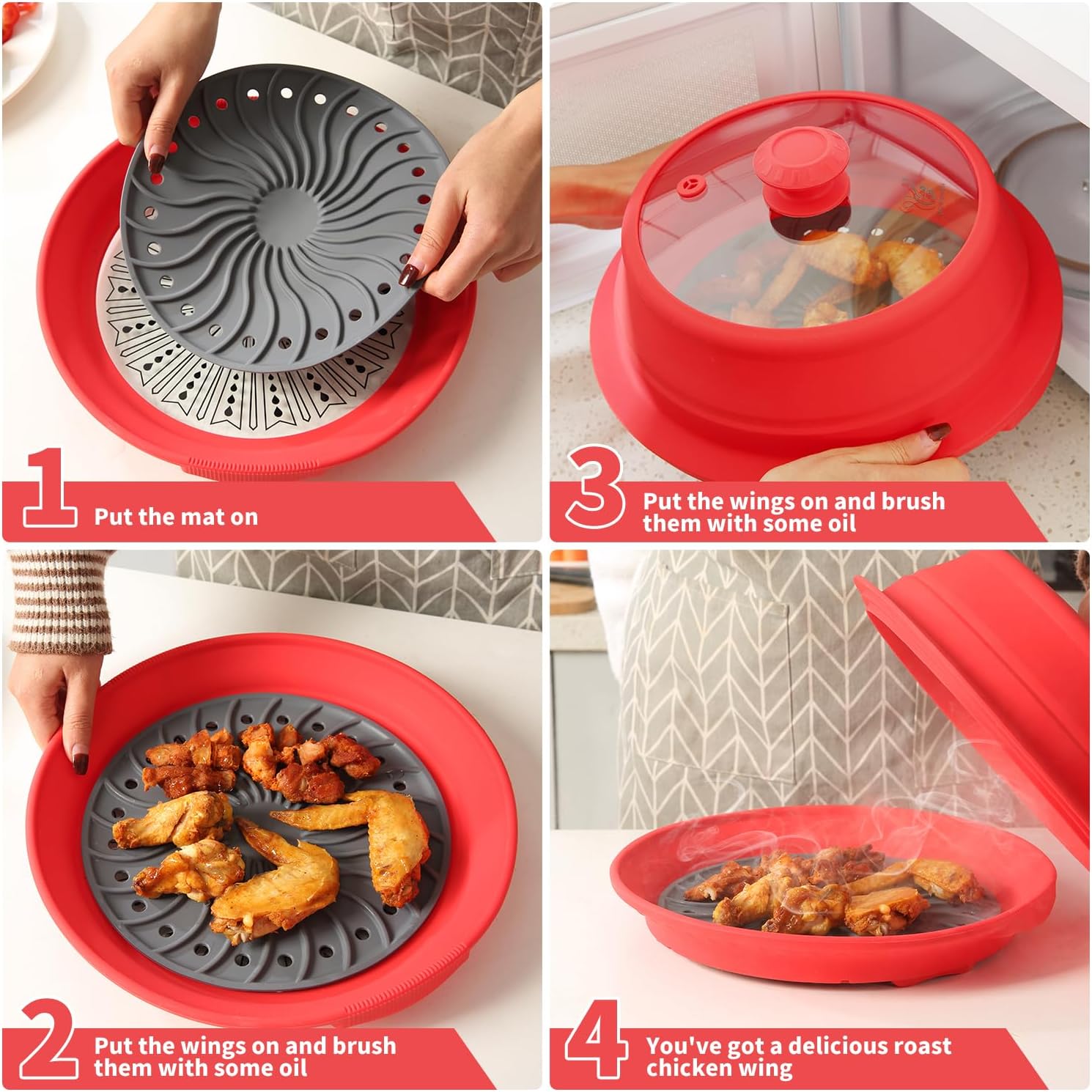 - 【Food Grade Material】: Food safe durable tempered glass and silicon, BPA and chemical free, High-temperature resistant glass, Foldable silicon microwave cover, Includes plate cover and tray to protect your microwave from splashes and spots. The tray has two handles to prevent burns and allow you to quickly remove heated food.