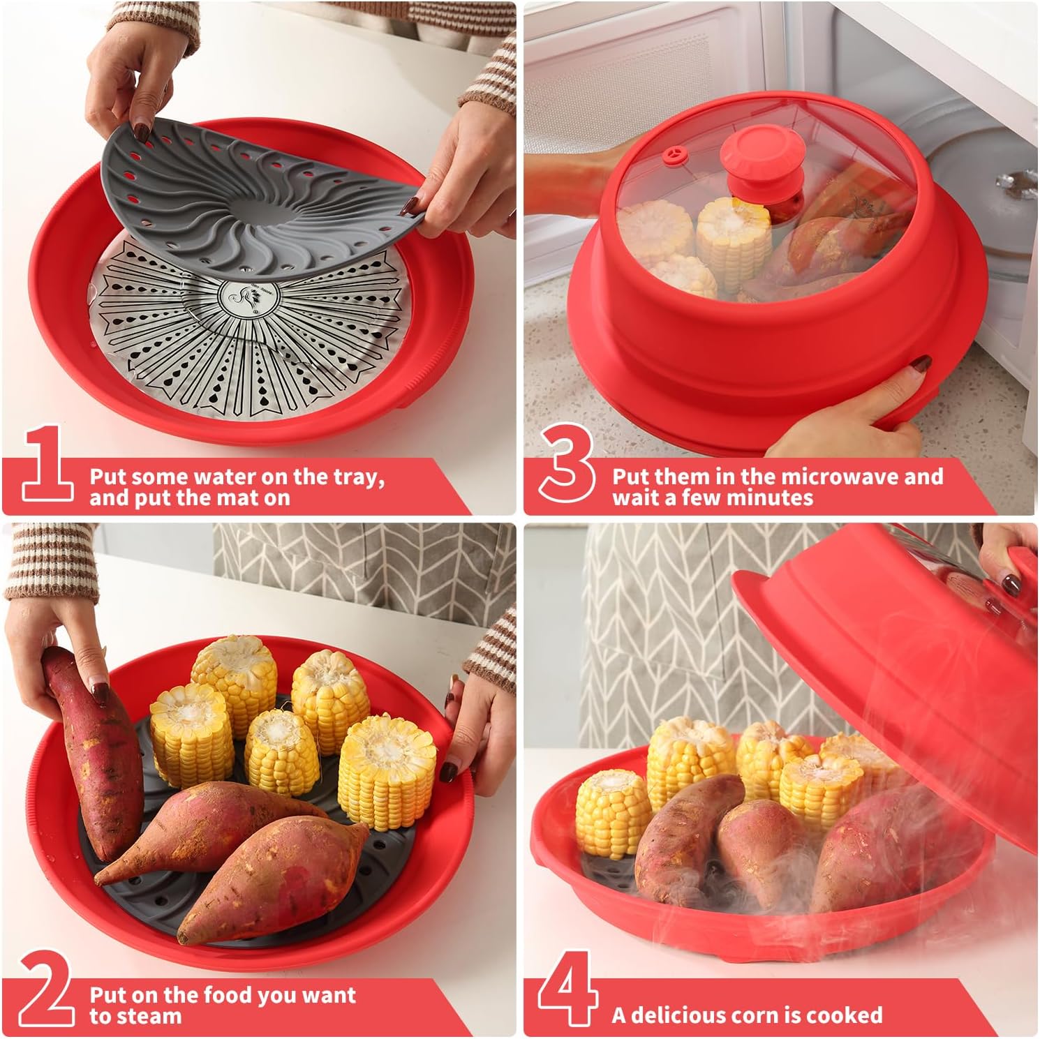 - 【Microwave Steamer】Microwave Steamer makes a healthy meal in minutes. just add water to the container, fill the basket with food, and heat. The steam release tab allows steam to escape while cooking. Ideal for a variety of vegetables, fish, and poultry.