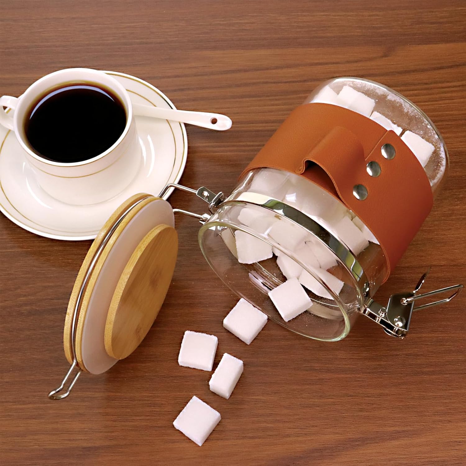 - 【Set of 2】 Glasses Storage Canister is made of high quality borosilicate glass, which is lead-free, BPA free, dishwasher safe, food-grade storage. It comes with an airtight bamboo lid and a metal spoon with wooden handle, that is sturdy, durable and easy for daily use.