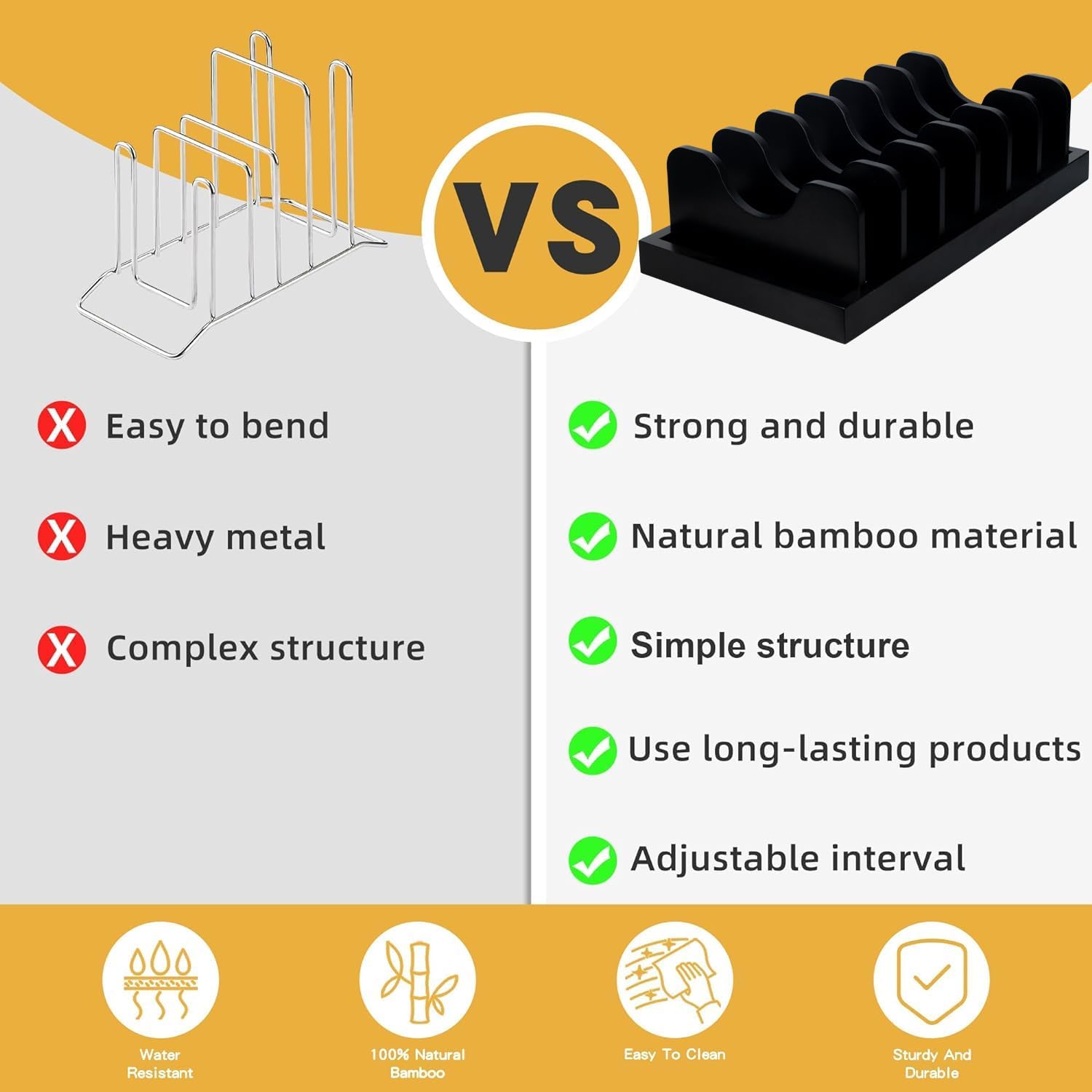 MinBoo Bamboo Pot Lid Organizer Pot Lid Holder, Pot and Pan Organizer Drawer Organizer for Pot Lids, Pans, Cutting Boards & Baking Sheets, Dinner Plates, Reusable Containers in Cabinet Storage,Black