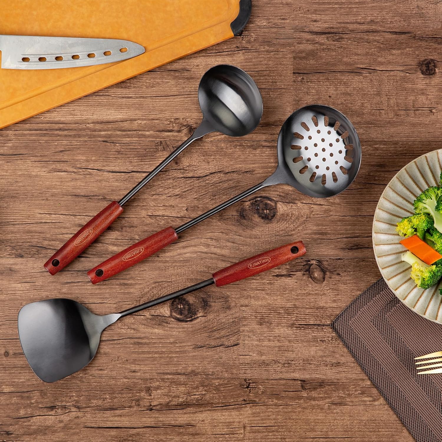 FJNATINH Wok Spatula and Ladle,Skimmer Ladle Tool Set, 17inches Spatula for Wok, 304 Stainless Steel Wok Spatula,Black