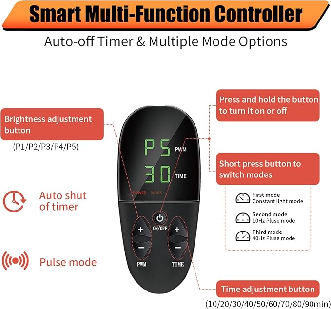 • 5 Levels Brightness Adjustment: The temperature changes when the intensity is adjusted. The higher the intensity, the higher the temperature.