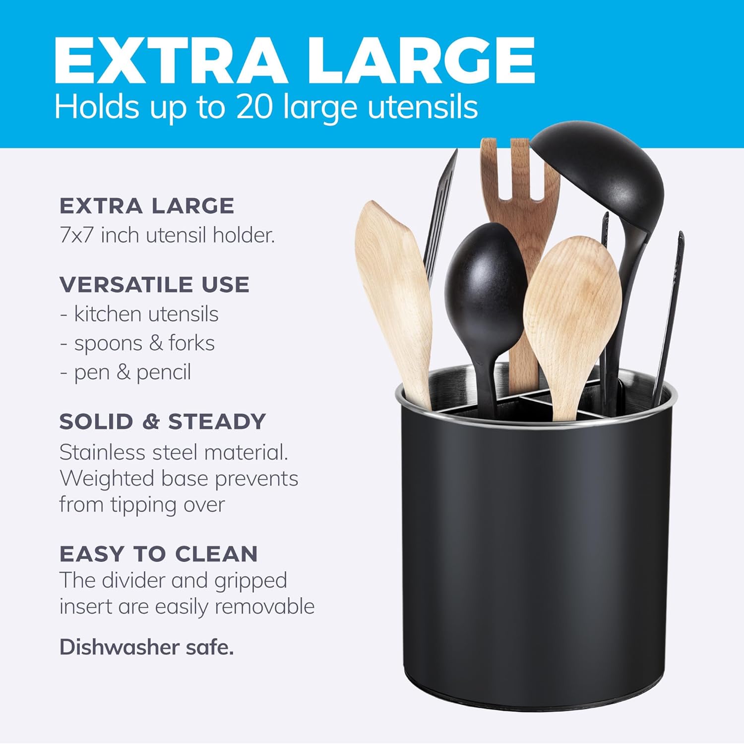 - CLEANING IS A BREEZE - Other metal utensil holders can rust and stain your counters with ugly spots over time, or they can scratch your countertops. Our cutlery holder has rubberized feet to ensure that it won't harm your counter or slide around, and is completely RUST-PROOF. The divider and gripped insert are easily removable, for hassle-free cleaning. The whole utensil crock is 100% DISHWASHER SAFE!