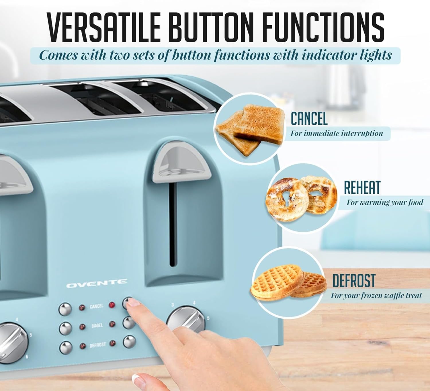 OVENTE Electric 4-Slice Toaster Machine with 6-Shade Selector Setting, Cancel Button, Defrost Function, Crumb Tray, 1400W Power and Wide Slots for Bagels, Waffles and Puff Pastry, Light Blue TS4410LBL