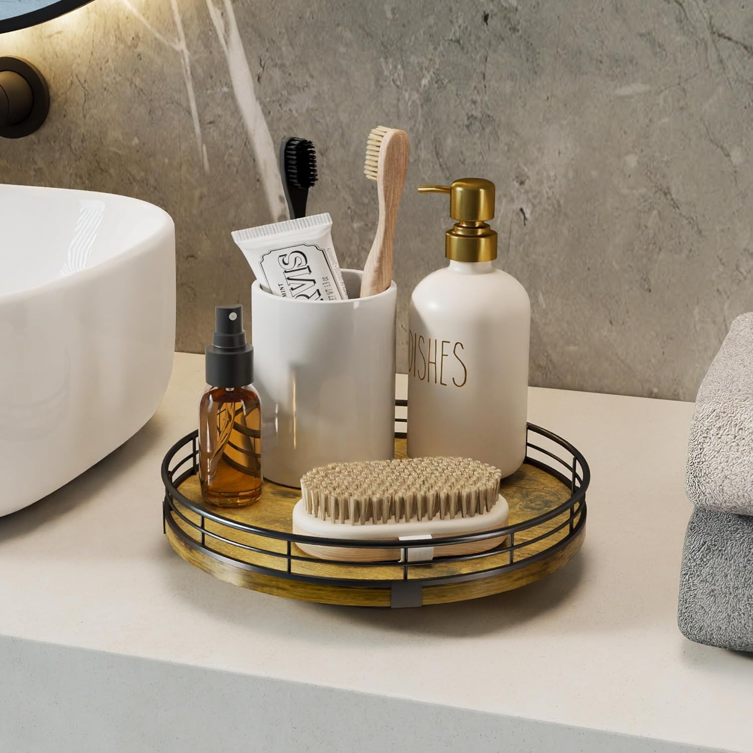 Lazy Susan Turntable Organizer for Table Top, 10’’ Round Wooden Lazy Susan for Cabinet Kitchen Countertop Pantry Dining Coffee Table for Condiments Spices, Rustic Bathroom Vanity Tray for Soap Candle