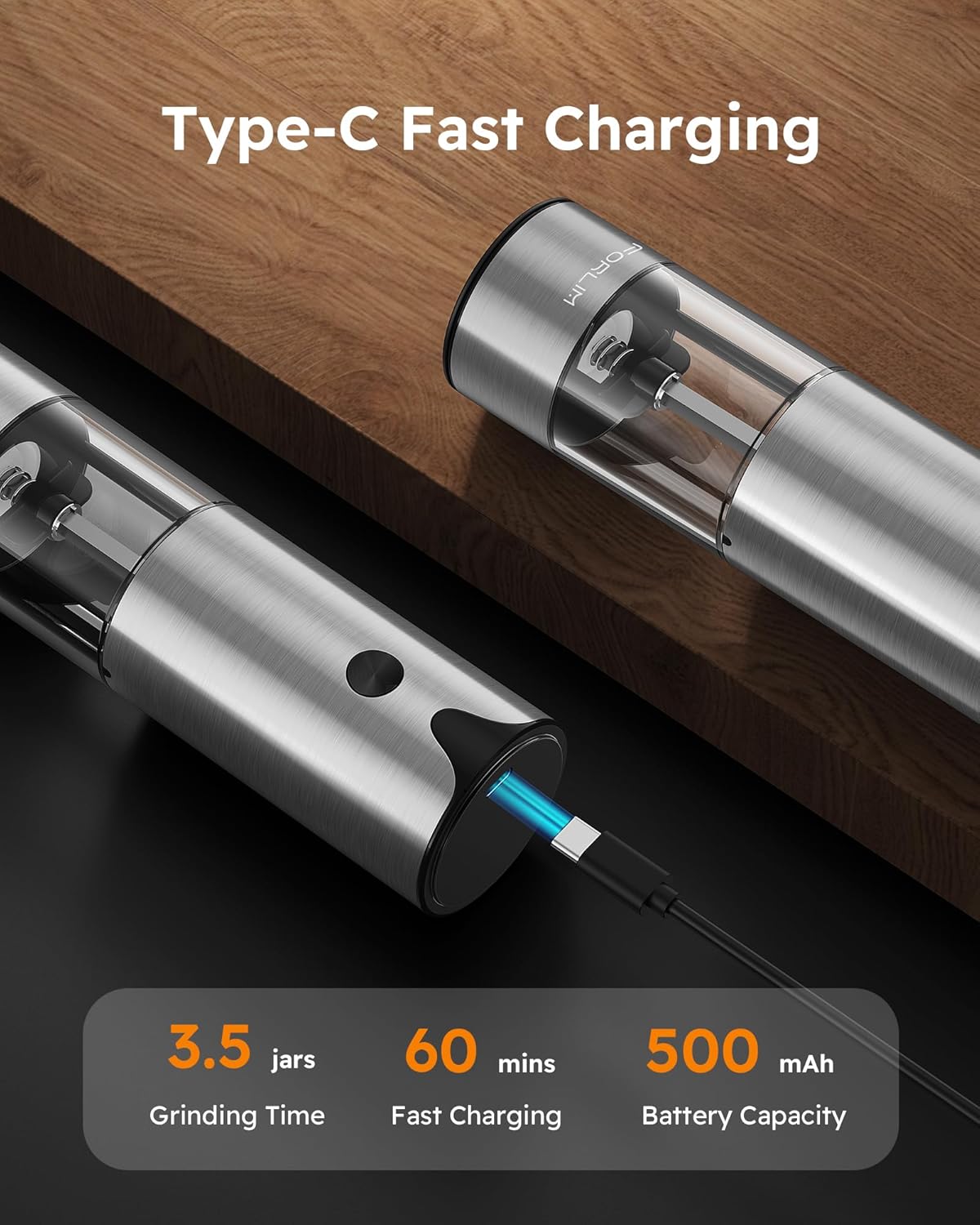 - USB Rapid Charging: FORLIM electric salt and pepper grinder set features a Type-C charging port for sustainable use. No more AAA battery hassles! Enjoy seamless fast charging right in your kitchen.