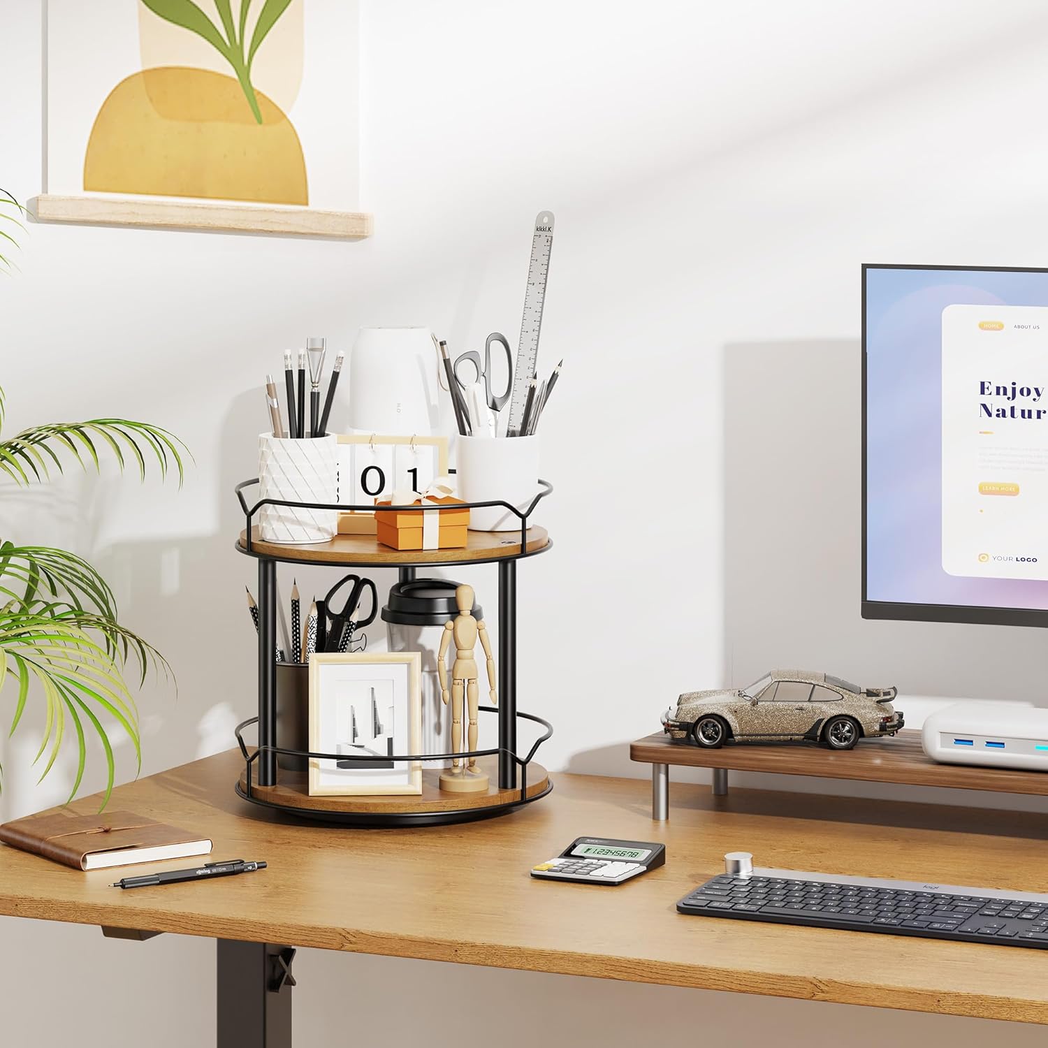 - 1. Stay Organized in Style: Ditch clutter and stay organized with our two-tier turntable Lazy Susan! This beautiful wooden rotating spice rack spinner is perfect for any table top, farmhouse bathroom decor, round decorative tray for your vanity, counter, sink, coffee table, and much more
