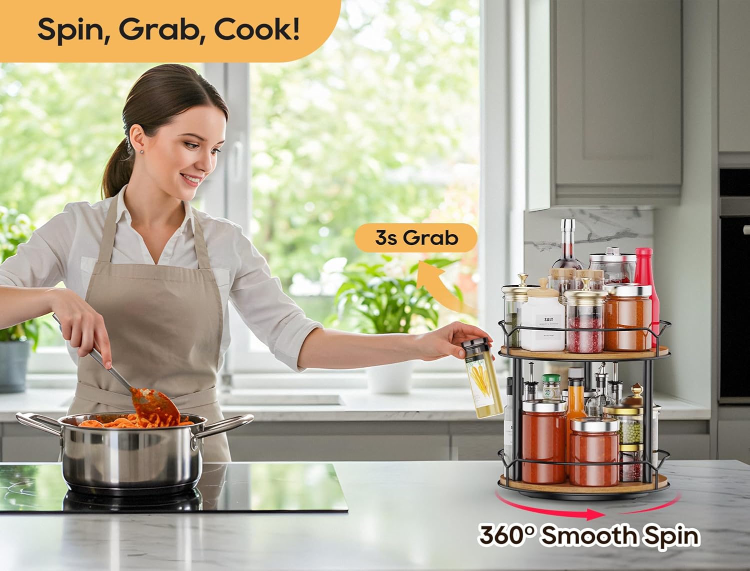 - 2. Efficient Design for Easy Access: Whether you're grabbing your favorite spices or toiletries, our Lazy Susan organizer makes it easy. The two-tier design allows for efficient storage, while the rotating design ensures easy access to all your items