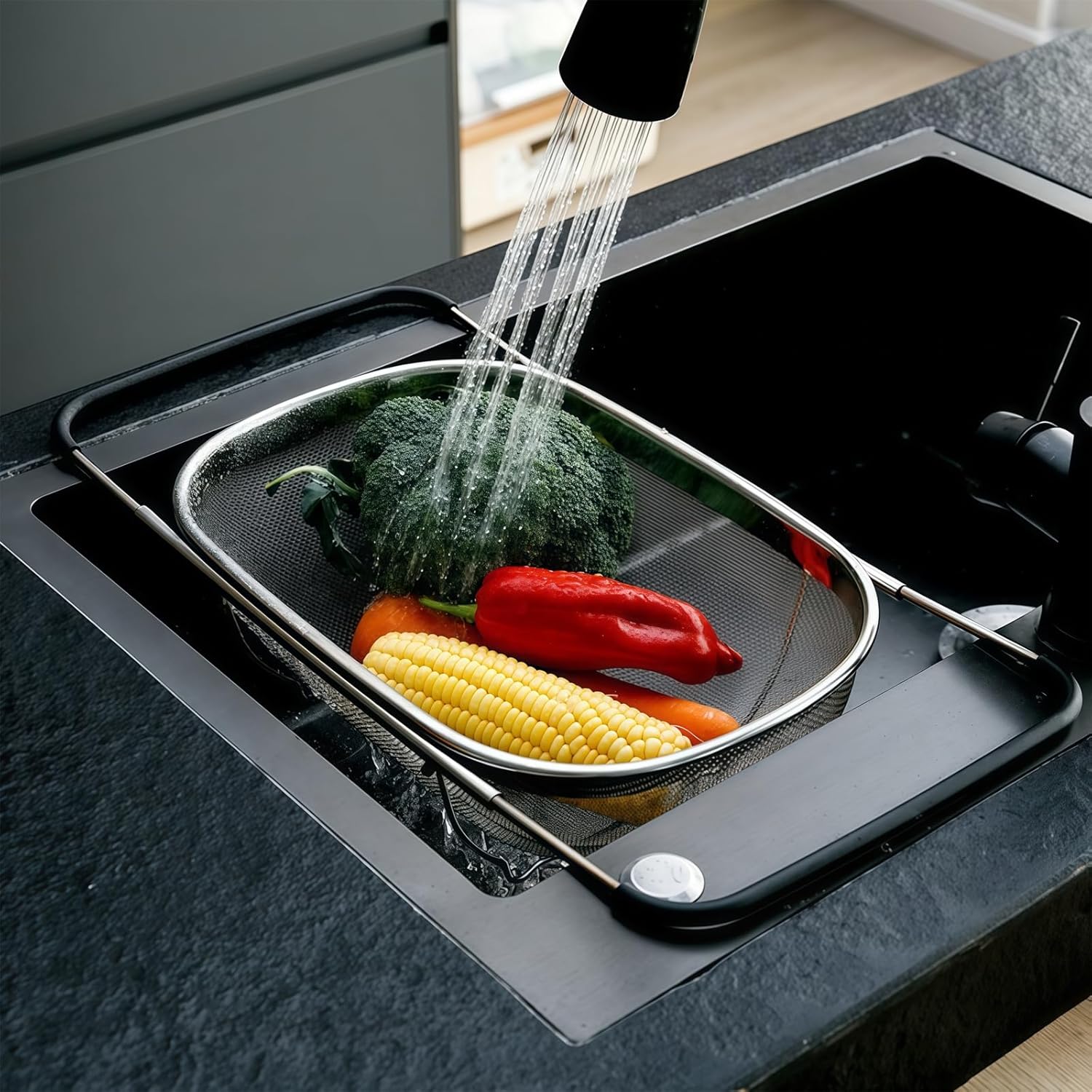 - Hands-Free Convenience: The colander's innovative design allows it to rest over the sink with the handles extended or collapse the handles to rest in the sink. This hands-free feature gives you the freedom to multitask while preparing food.