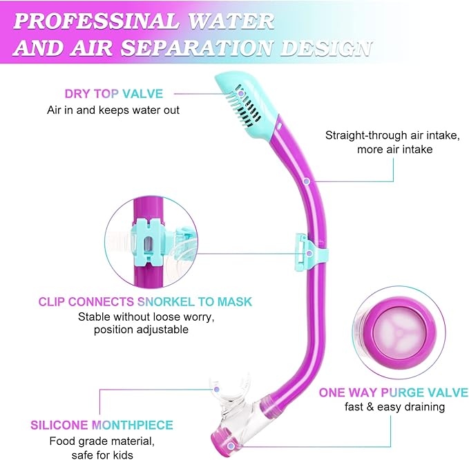 • 【DRY TOP SNORKEL & PURGE VALVE】The Snorkel adopts the most stable dry float valve design. When immersed in water, the top float valve will close automatically to prevent water from entering the breathing tube, the lower purge valve can quickly drain water, so that children will not be choked by water. Food grade soft liquid silicone mouthpiece is durable and safe for children to use.