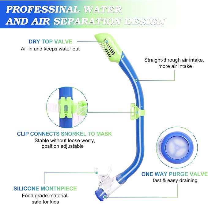 • 【DRY TOP SNORKEL & PURGE VALVE】The Snorkel adopts the most stable dry float valve design. When immersed in water, the top float valve will close automatically to prevent water from entering the breathing tube, the lower purge valve can quickly drain water, so that children will not be choked by water. Food grade soft liquid silicone mouthpiece is durable and safe for children to use.