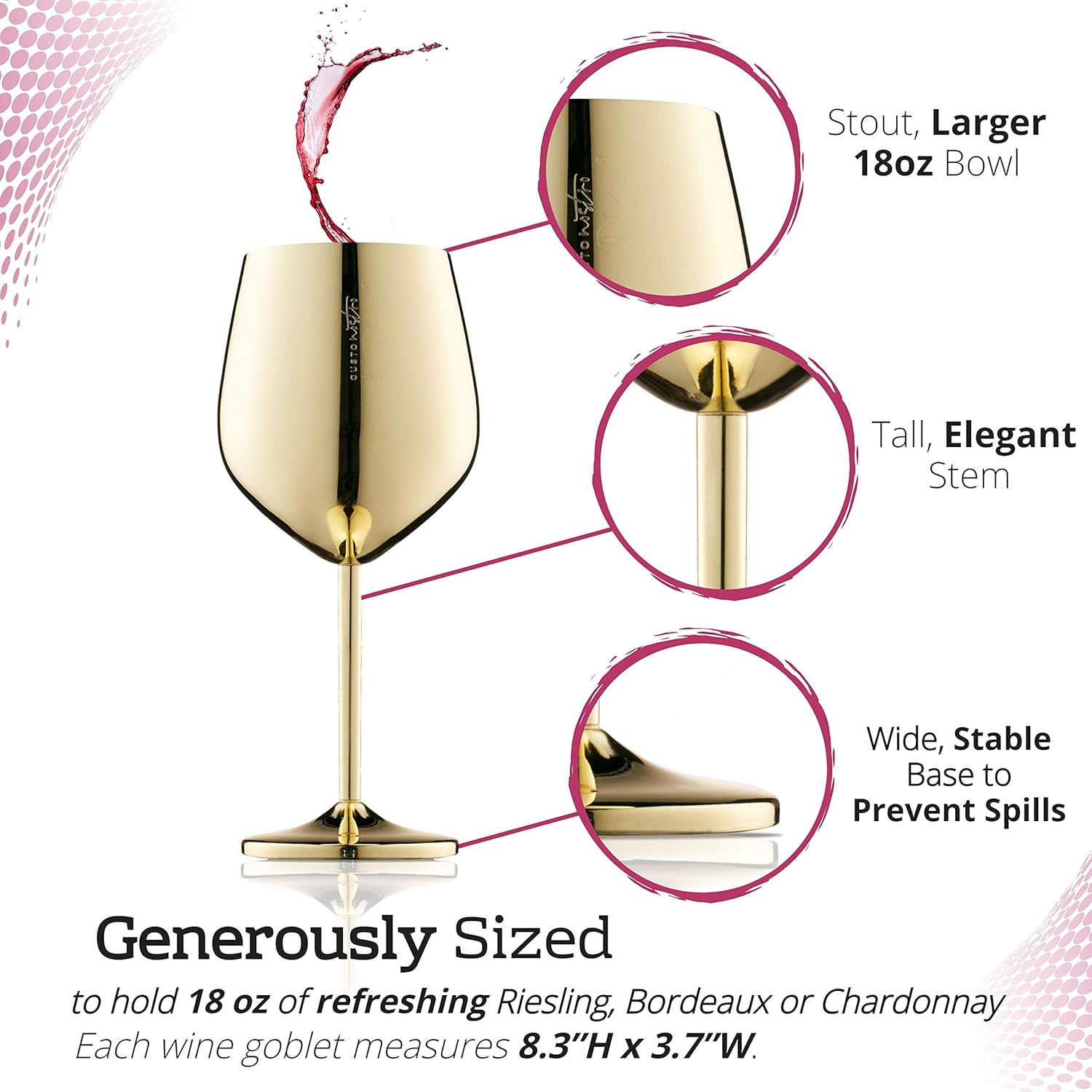 Gusto Nostro Stainless Steel Wine Glass - 18 oz Unbreakable Gold Wine Glasses for Travel, Camping and Pool - Fancy, Unique and Cute Portable Metal Wine Glass for Outdoor Events, Picnics (Set of 4)