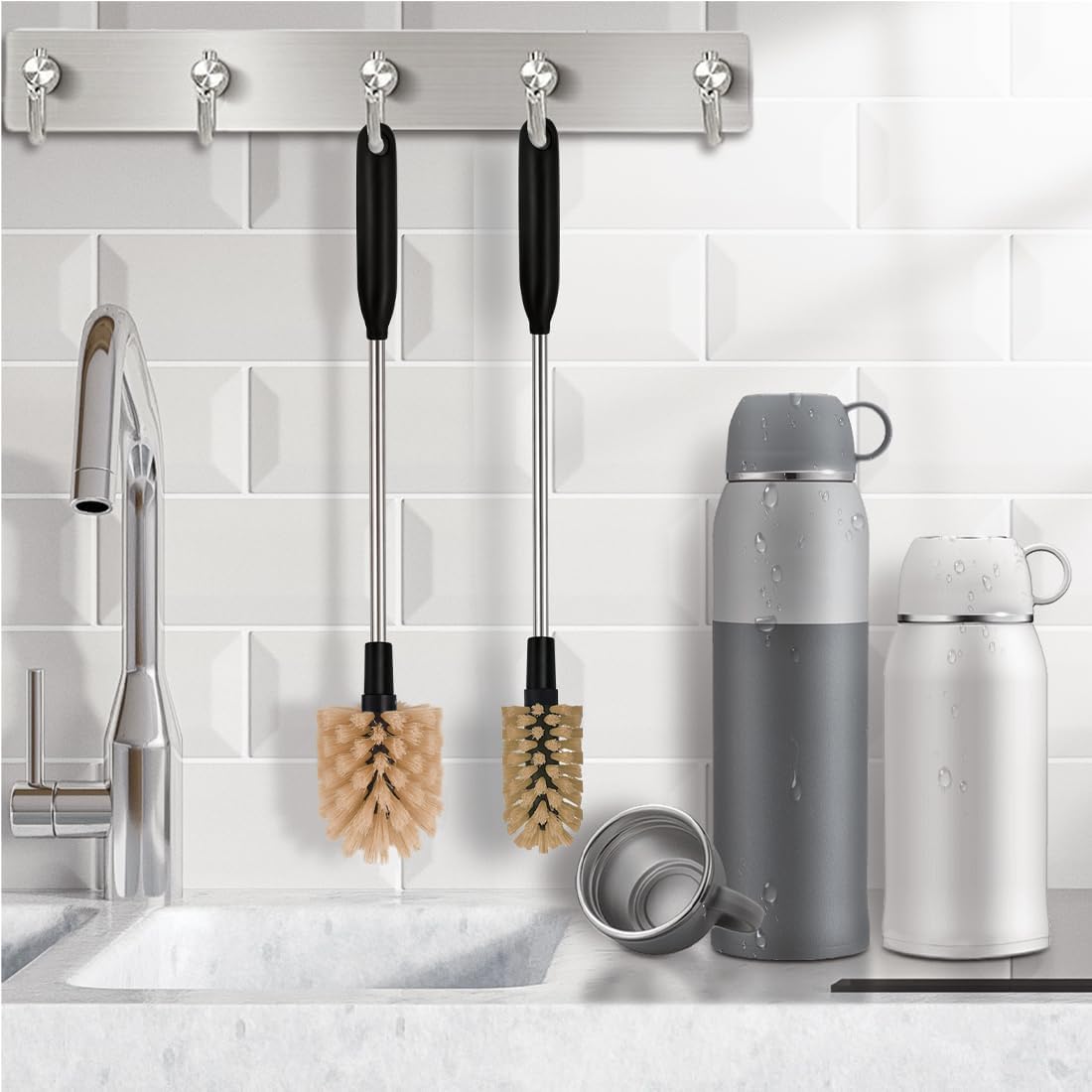 - Effective cleaning brush for cleaning all kinds of water bottles, glassware, insulated water bottles, milk bottles, including food jars and brewers. Hanging design on the bottom of the handle, 7mm round hole can be easily hung on the wall or kitchen utensil rack for easy storage.