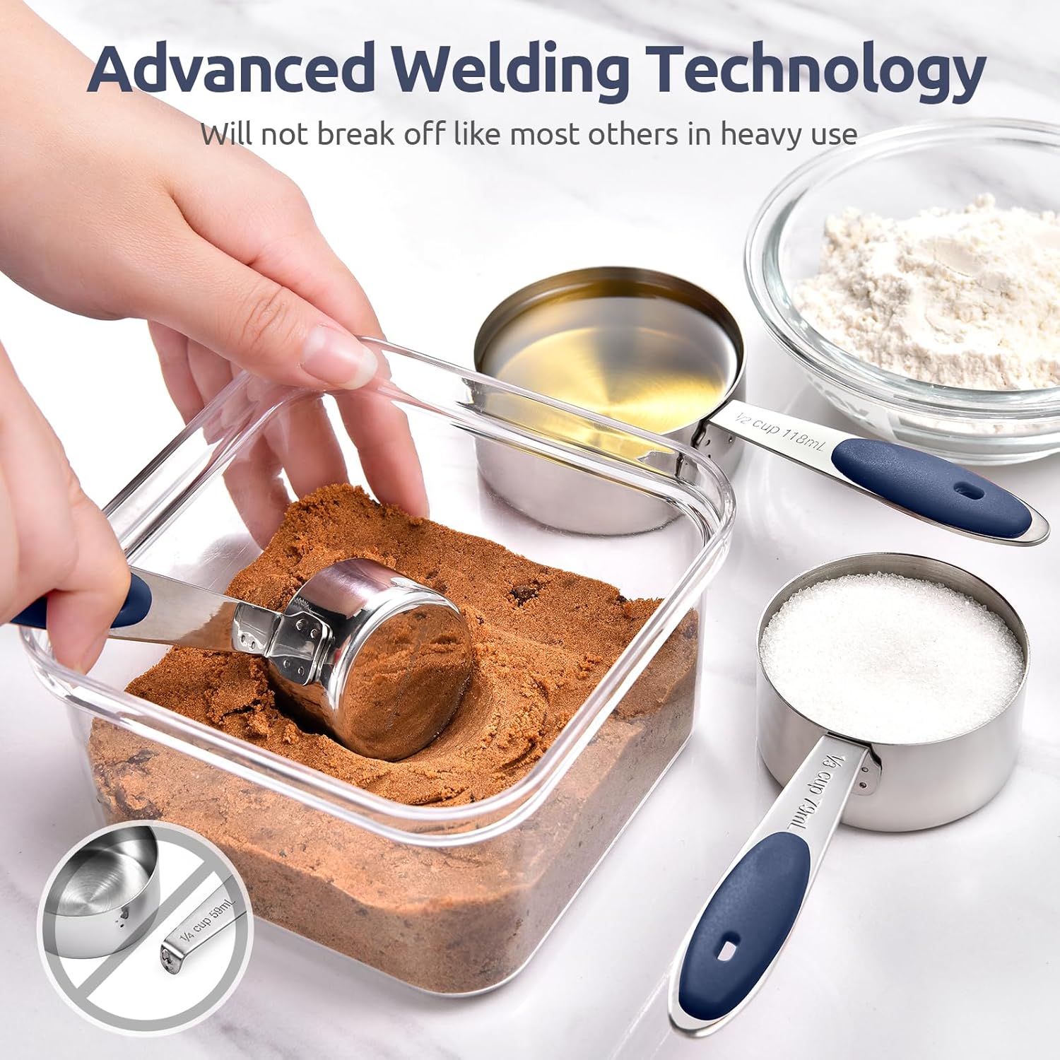 - [Engraved measurement will never rub off] If you are bothered by painted measurement (easy to fade) like 16.29% persons point out, you can choose our engraved metric measurements which is easy to read and will not rub off. To ensure accurate measuring in cooking/baking, this measuring cup set includes 1/8 cup, 1/4 cup, 1/3 cup, 1/2 cup, 1 cup and 1/4 tsp, 1/2 tsp, 1 tsp, 1/2 tbsp, 1 tbsp.