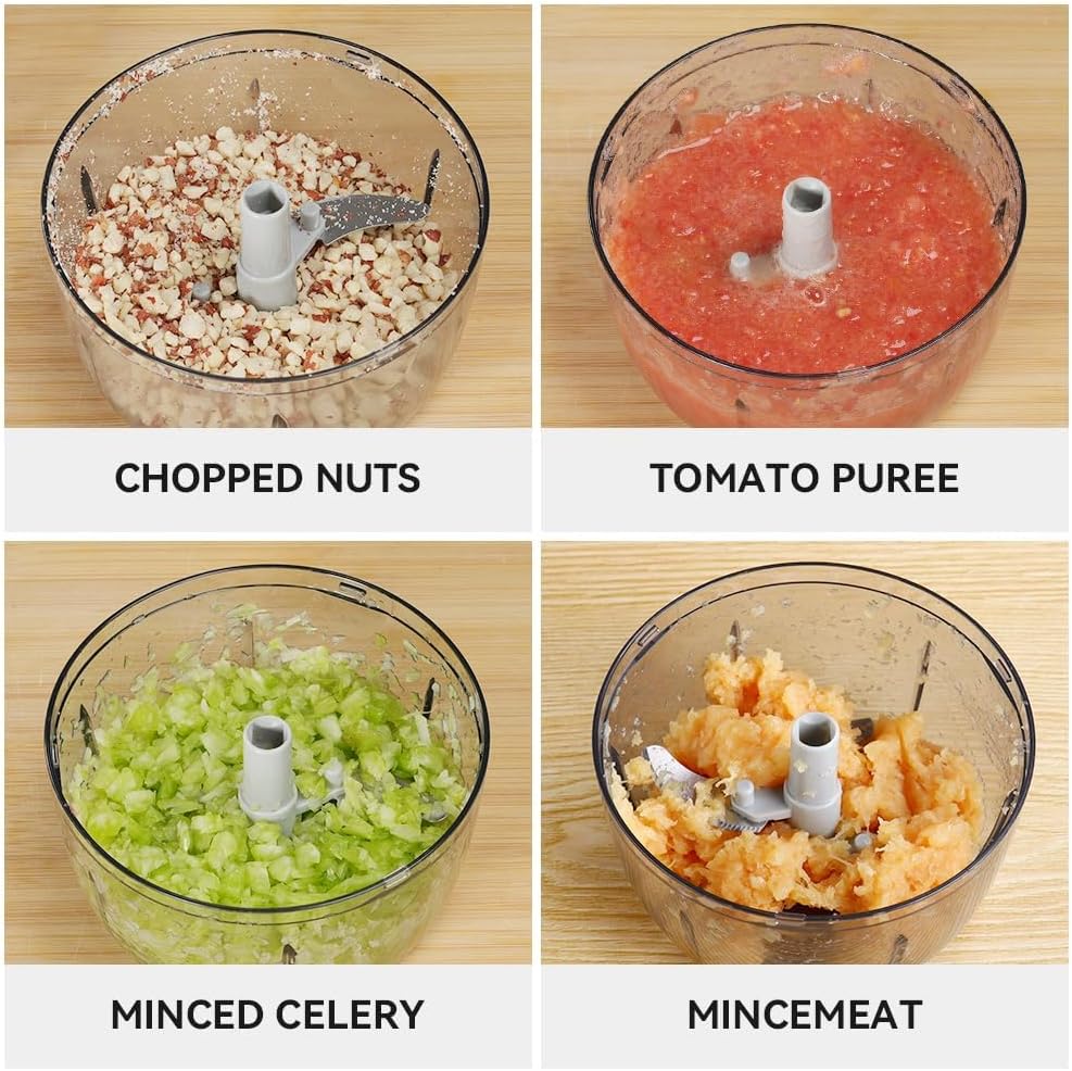 - 🥦This small pull chopper will really help you in the kitchen: It doesn't just quickly process garlic and Onions, it can process a lot of other ingredients, ideal for avocado, ginger, tomato, potato, celery, chili, chicken, fish, shrimp, cabbage, carrot, coriander, herb, radish, sweet potato, cauliflower, pepper, nuts, mushroom, cucumber, watermelon, boneless and skinless meat and so on! You can cook a lot of delicious food with ease, such as salad, salsa, pesto, hummus, guacamole and so on!