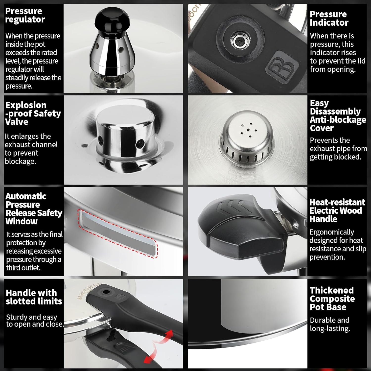 - β [Crafted from top-grade stainless steel and durability]-Our Stainless Steel Pressure Cooker guarantees food safety and prevents any harmful reactions with your ingredients. Keep all the nutrients and flavors intact the healthier way! Our pressure cooker boasts quality stainless steel components and ergonomic handles for rust resistance and heat endurance.
