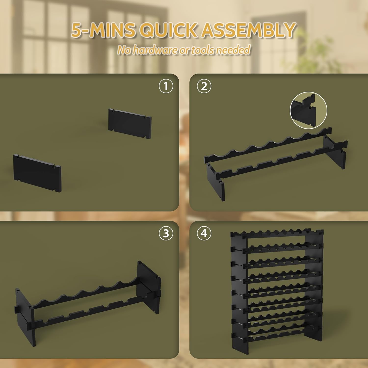 - ๐๐ฎ๐๐ ๐๐๐๐ฒ๐บ๐ฏ๐น๐: Each shelf of this modular stackable wine rack features deep grooves and the partitions are tightly fastened to each other without loosening; No tools required, Simple follow the assembly instructions to combine the partitions in order, and you'll have an elegant wooden wine rack in about 5 minutes (Please make sure whether the parts are positioned correctly before assembly); If you need to move the wine rack, please be sure to remove the wine bottles first