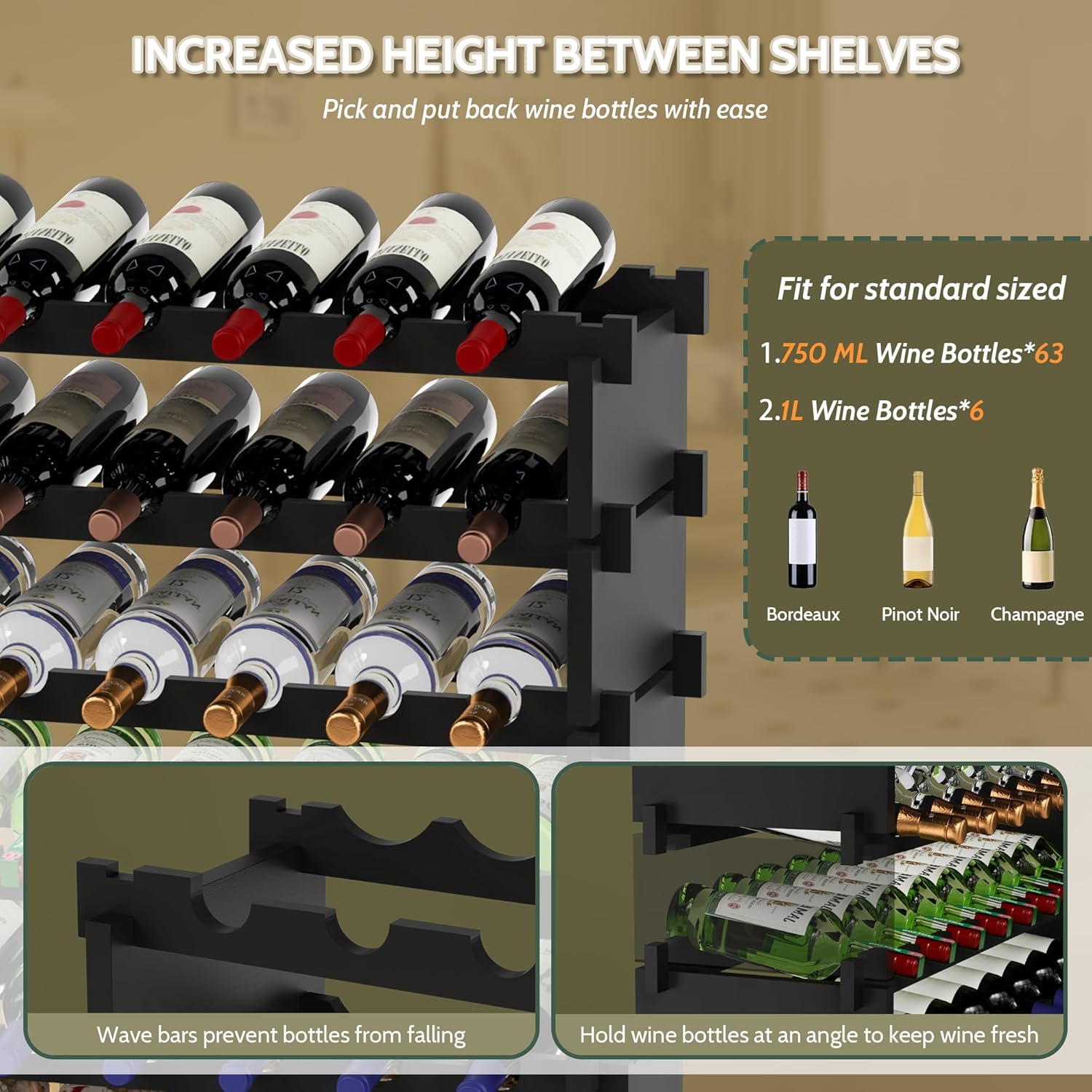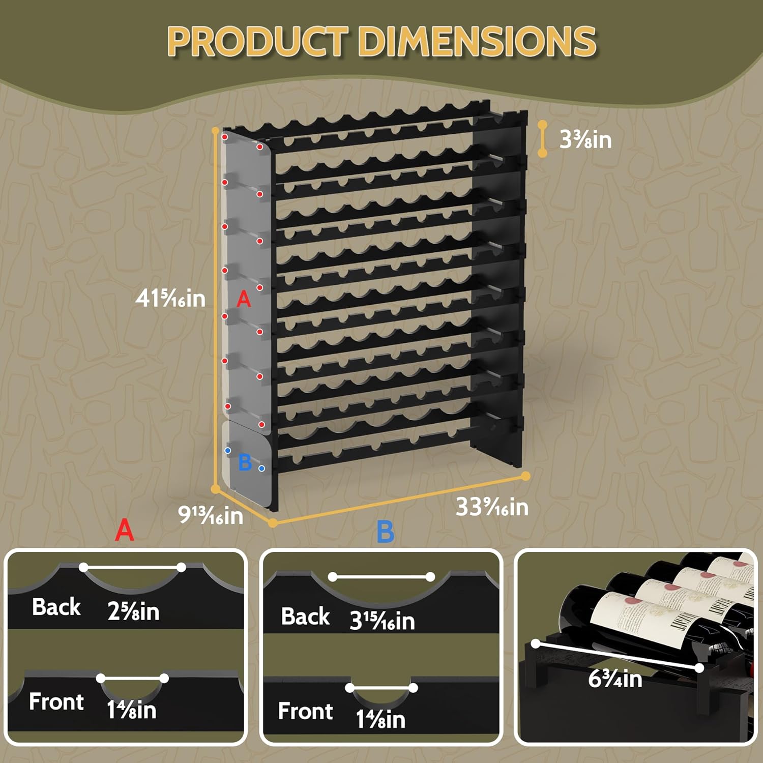- ๐ฒ๐ต ๐๐ผ๐๐๐น๐ฒ๐ ๐๐ฎ๐ฝ๐ฎ๐ฐ๐ถ๐๐: Assembled dimensions are approx.: 33.5" L x 10" W x 40.98" H; This wine racks free standing floor is perfect for showcasing your favorite vintages; It accommodates not only standard 750ml bottles but also has one layer with wider spacing to accommodate larger bottles, fitting 90% of bottle sizes on the market, catering to both seasoned collectors and those just starting their wine journey
