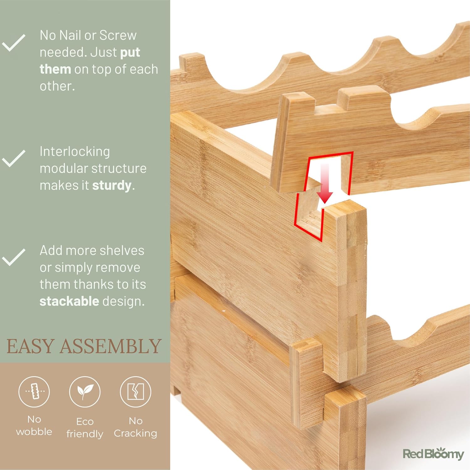 - Effortless Assembly: No tools, no hassle. The modular wine stacker is incredibly easy to set up. The freestanding 8-tier modular wine display shelf consists of 16 wave bars and 16 blocks that effortlessly snap together without the need for any hardware or tools. Assemble your wine rack in just 2 minutes or less.