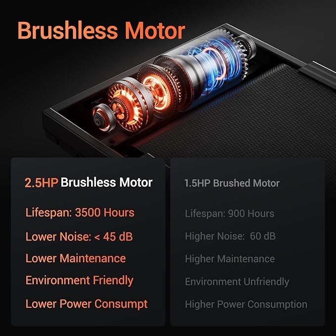 • 【Powerful and Quiet Brushless Motor】This treadmill for home features a high-cost brushless motor, which is more efficient than ordinary brushed motors. It delivers a maximum speed of 7.5 MPH with 3.0 HP, using less power. The motor's lifespan extends from 900 hours to 3500 hours, nearly four times longer! Additionally, noise levels are kept below 45DB, ensuring a quiet and comfortable exercise environment.