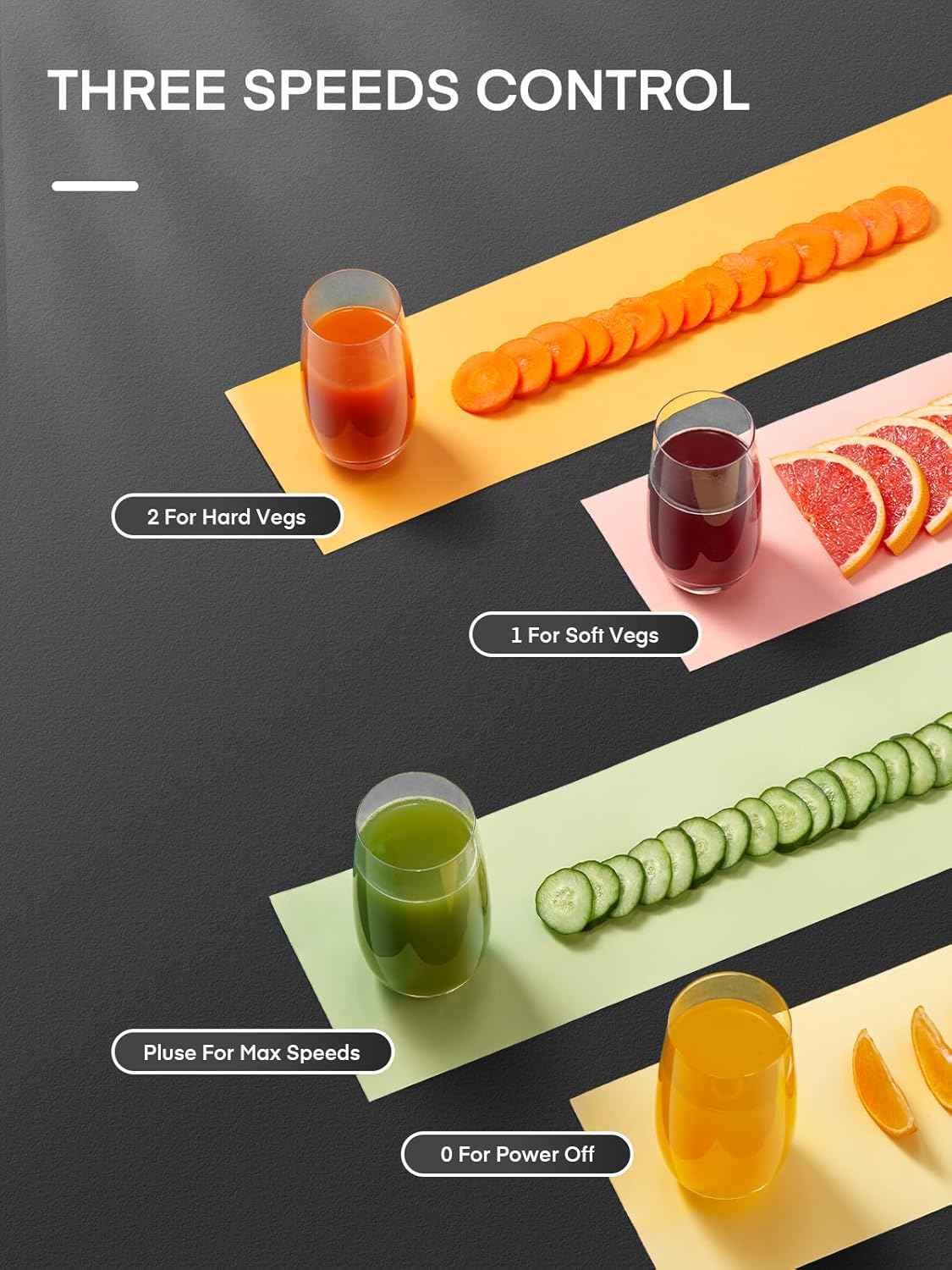 - 3-Speed Functions - "1" is a low speed, for soft fruits vegetables like oranges, watermelon, tomato, etc; "2" is a high speed, for hard food like apple, carrot, celery, etc. “P” is the highest speed(Reach maximum speed after release). Customize your favorite juices, it makes the kitchen more colorful, you could juice a bunch of fresh juice and drink them to replenish energy and nutrition when needed