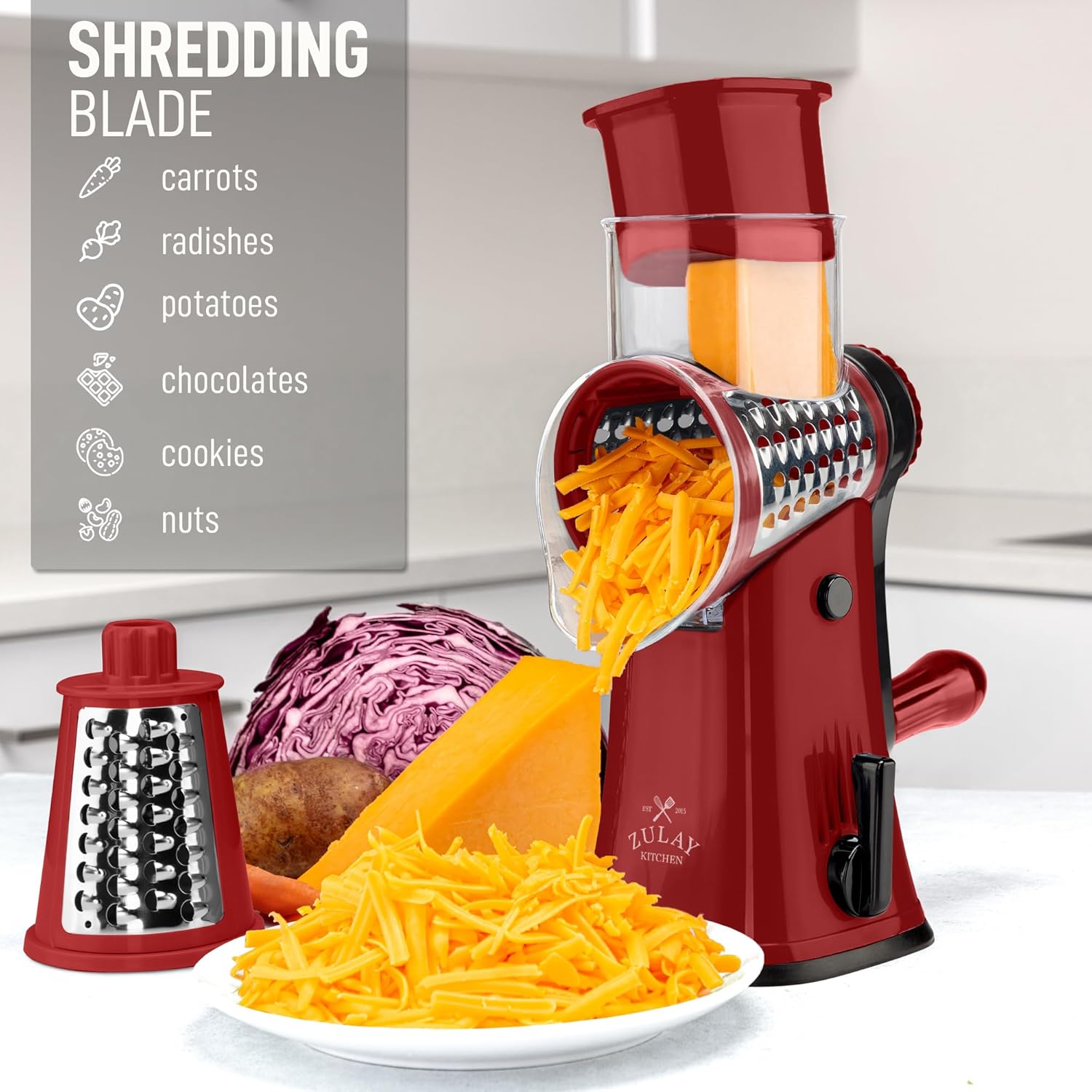 - GRATE, SLICE, AND SHRED: With 5 interchangeable stainless steel blades, this rotary grater is perfect for thin and wavy vegetable slicing, coarse shredding, and fine and coarse julienne. The sharp blades of this multifunctional grater are perfect for grating with carrots, cucumbers, potatoes, nuts, cookies, and even a soft block of cheese.