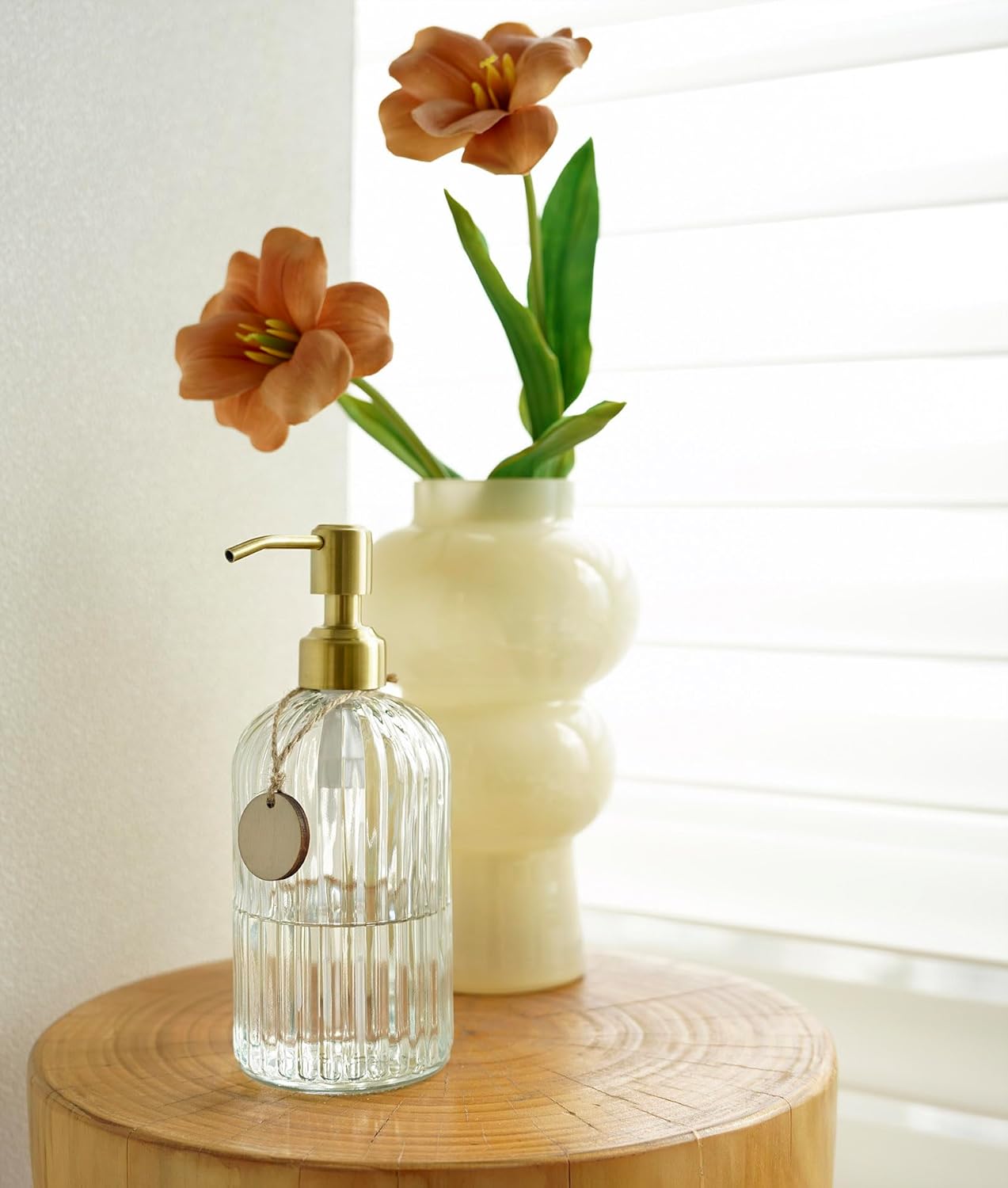 JASAI 18Oz Glass Soap Dispenser with Golden Pump for Kitchen,Refillable Liquid Hand soap Dispenser with Vertical Stripe, Clear Soap Dispenser Bathroom for Hand soap, Dish Soap, Lotion