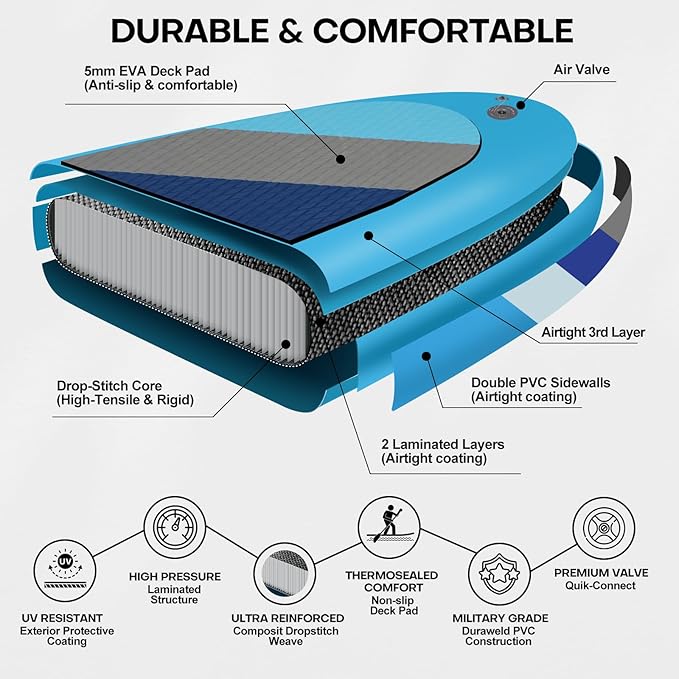• Premium Military-Grade Construction: The inflatable SUP made of drop-stitch core and double PVC material for exceptional rigidity and puncture resistance, resists deformation under 350 lbs load. UV-resistant & thermosealed layers ensure long-lasting durability for ocean, lake, and river adventures.