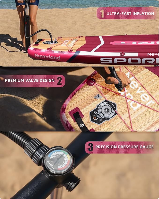 • 【Easy inflation & attractive design】SPORIT inflatable paddle board features convenient inflation and deflation capabilities. Equipped with a dual-action pump and high-end valve, it allows for effortless inflation and deflation. You can have it ready in just a few minutes, making it convenient and quick. Additionally, this paddle board has a stylish and unique design that adds charm and captures attention during your water adventures.