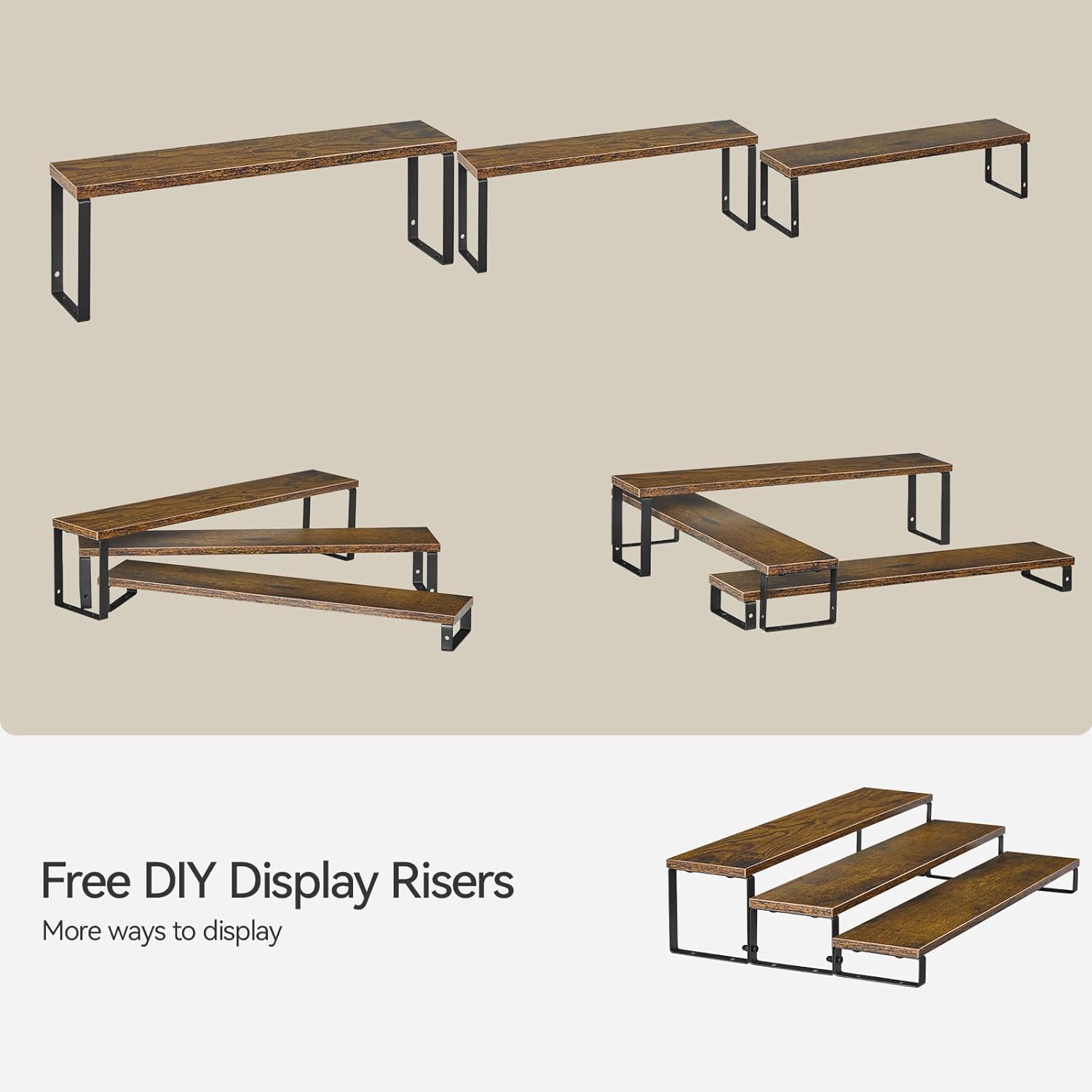 - Quick Setup & Easy Cleaning: You can have this 3-tier display riser stand assembled in 10 minutes with detailed instructions and tools. The wooden surface is waterproof and dust-free, a damp cloth could keep the counter shelf clean. (Assembly tools and accessories are included in the package)