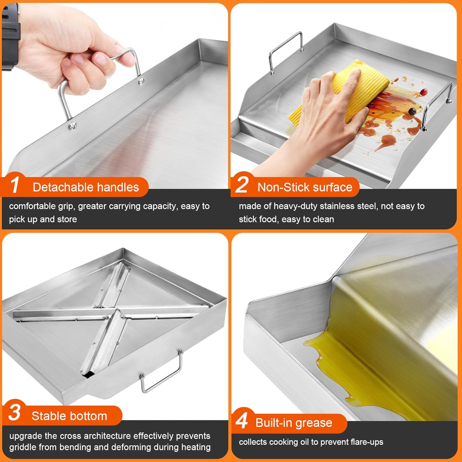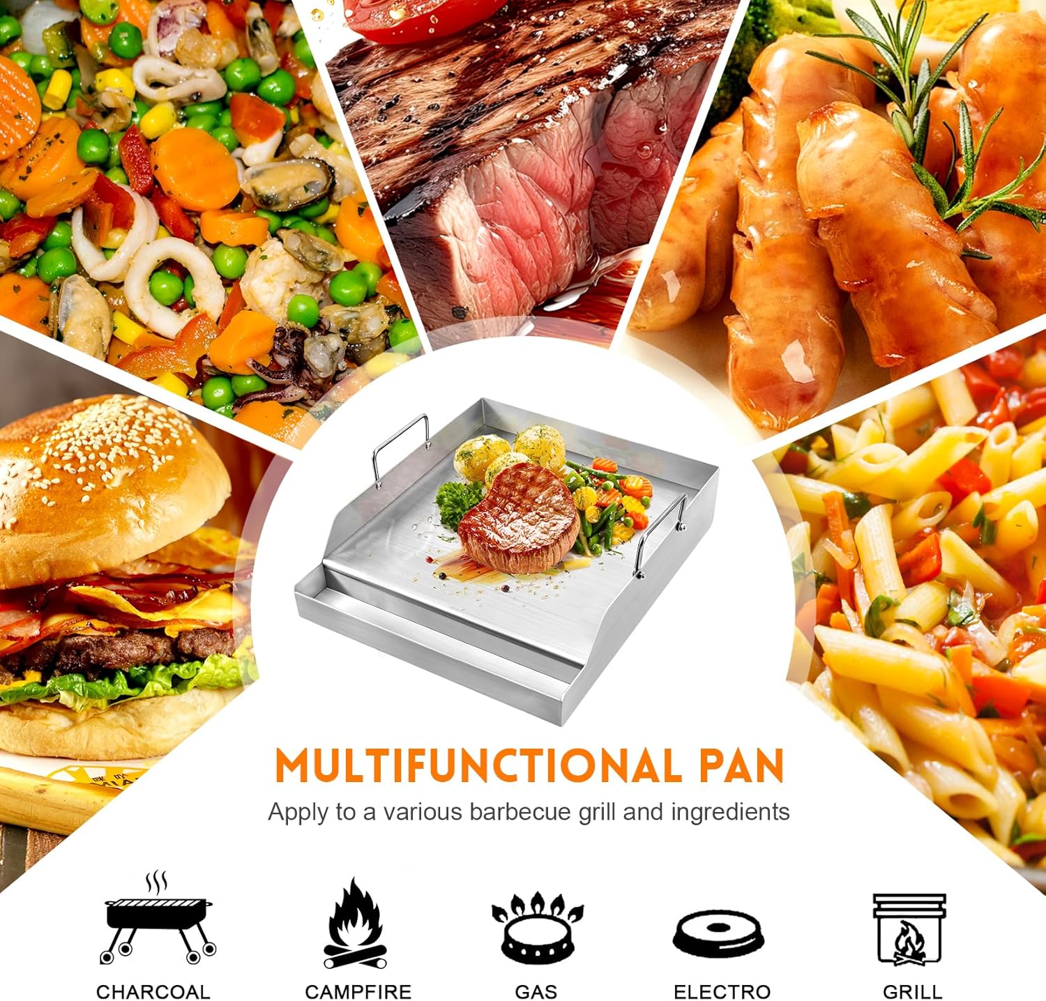 - 【High Quality Stainless Steel Cooking Griddle- Non stick】: The universal flat top griddle pan made of food grade stainless steel. Stainless steel griddle can heat food faster and more evenly, and are easier to clean. You no longer have to worry about stuck-on food particles