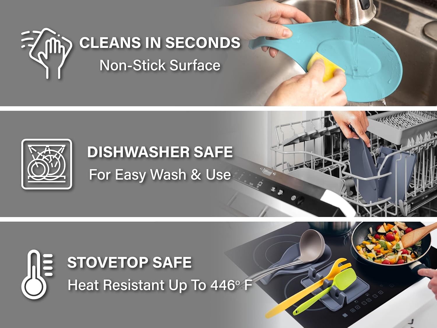 - EASY TO USE, EVEN EASIER TO CLEAN – Food residues and liquids slide off the non-stick silicone surface of our silicone spoon rest for kitchen counter in mere seconds. Simply rinse or wipe for quick cleanup (NO SCRUBBING NEEDED), or place in the dishwasher for a thorough cleaning (DISHWASHER SAFE).