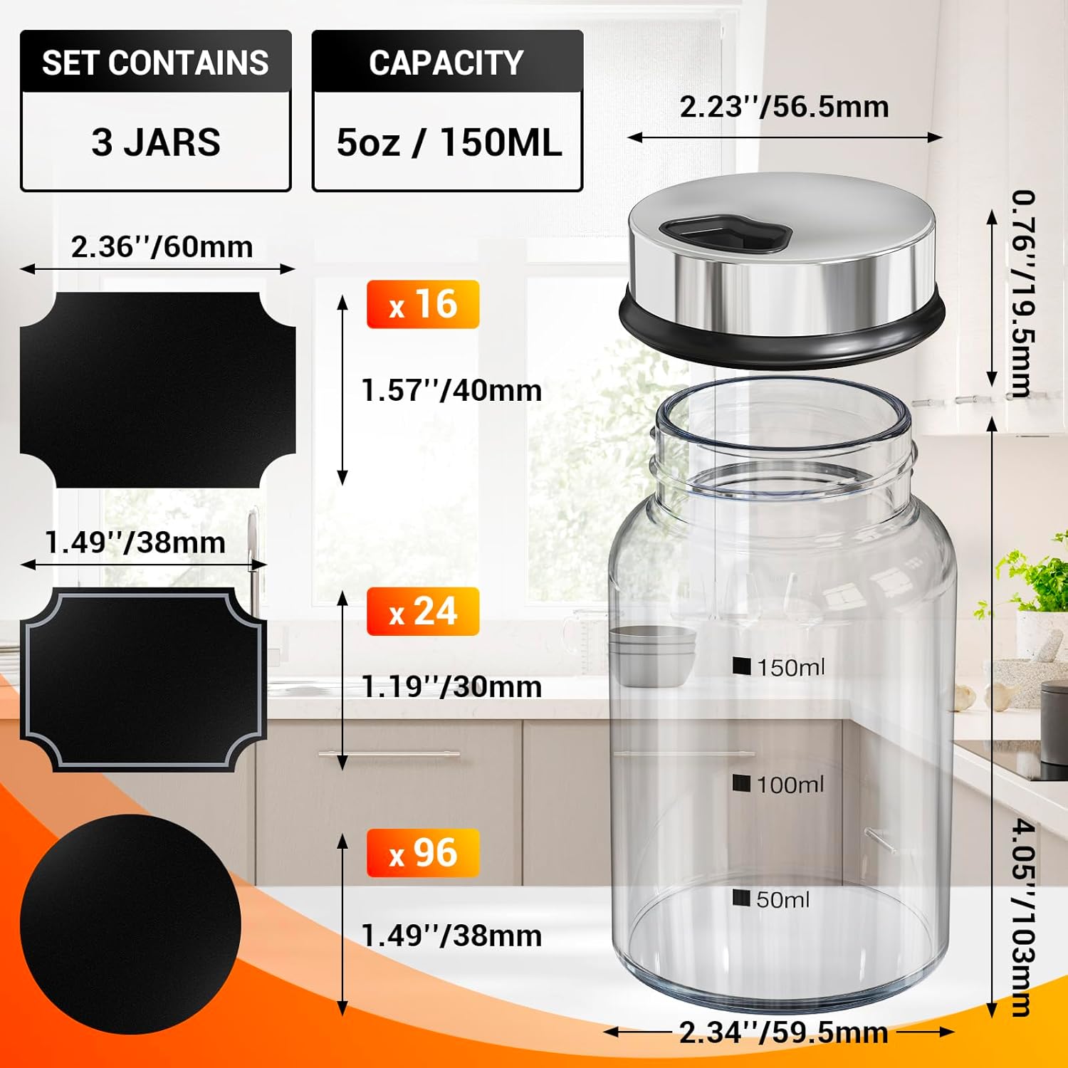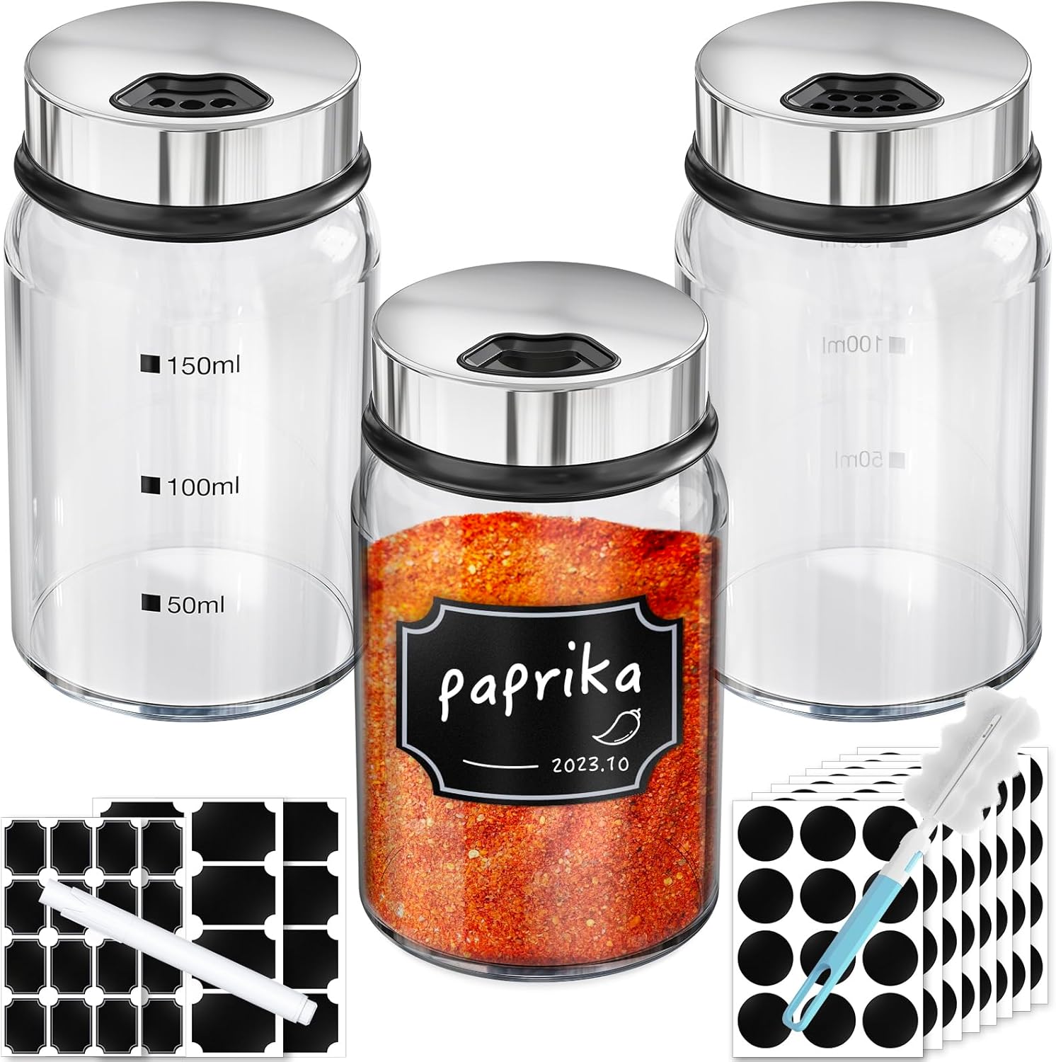 - 3PCS Glass Seasoning Jars Set: This empty spices jars with label set includes 3 pack of 5oz condiment bottles, 136 black blank labels and 1 white chalk marker pen. Each package offers a complete solution for storing and labeling spices. The clear condiment bottles, seamlessly integrate into any kitchen space,such as drawer,cabinet, as great organizer for keeping condiments. The set comes with black label paper for customization, and the marker pen makes labeling a convenient process.