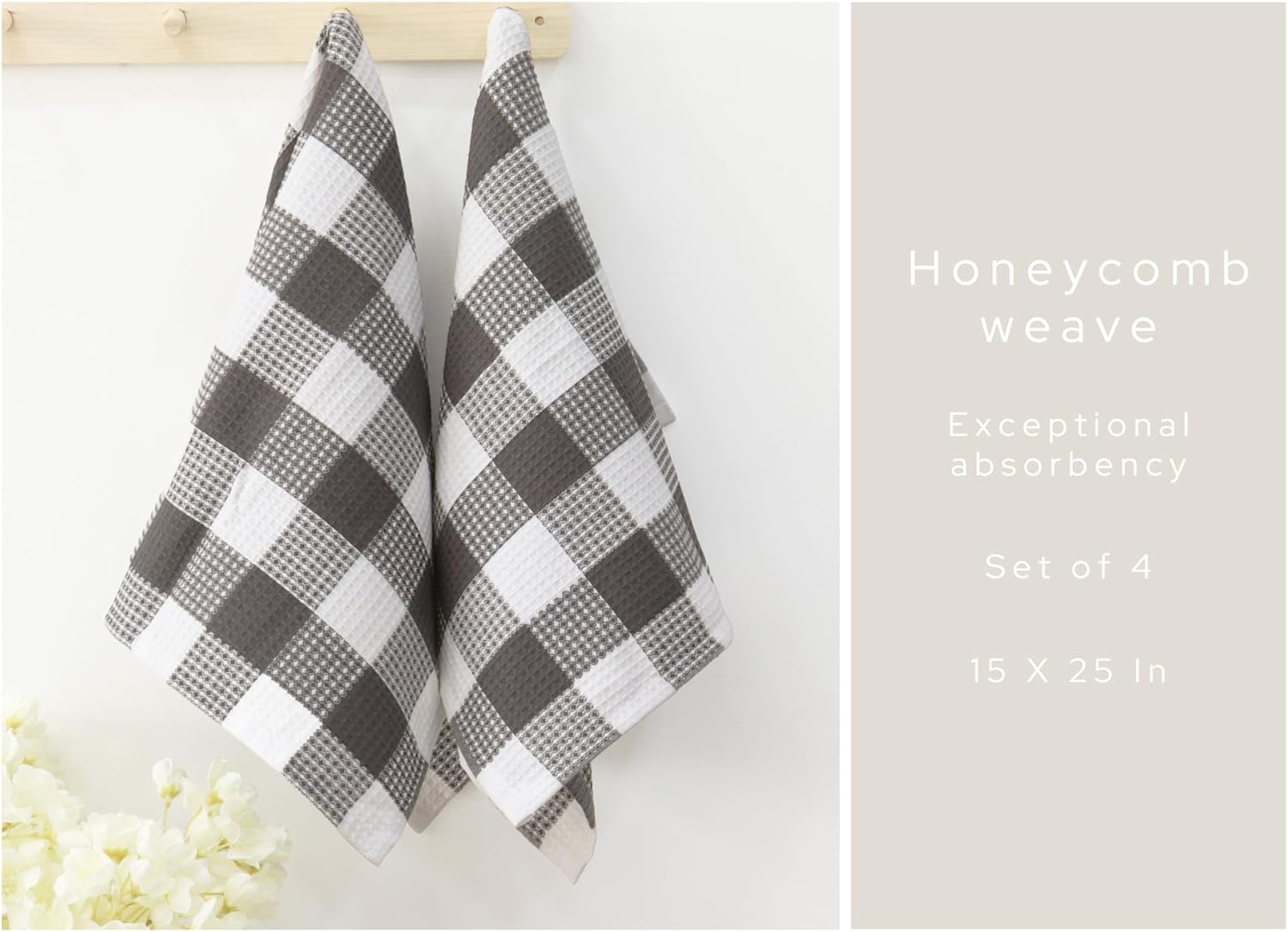 PurpleEssences 100% Cotton Waffle Weave Check Plaid Kitchen Towels, Super Soft and Absorbent Dish Towels for Drying Dishes 15 x 25-4 Pack - Spring Summer - Steel Grey and White