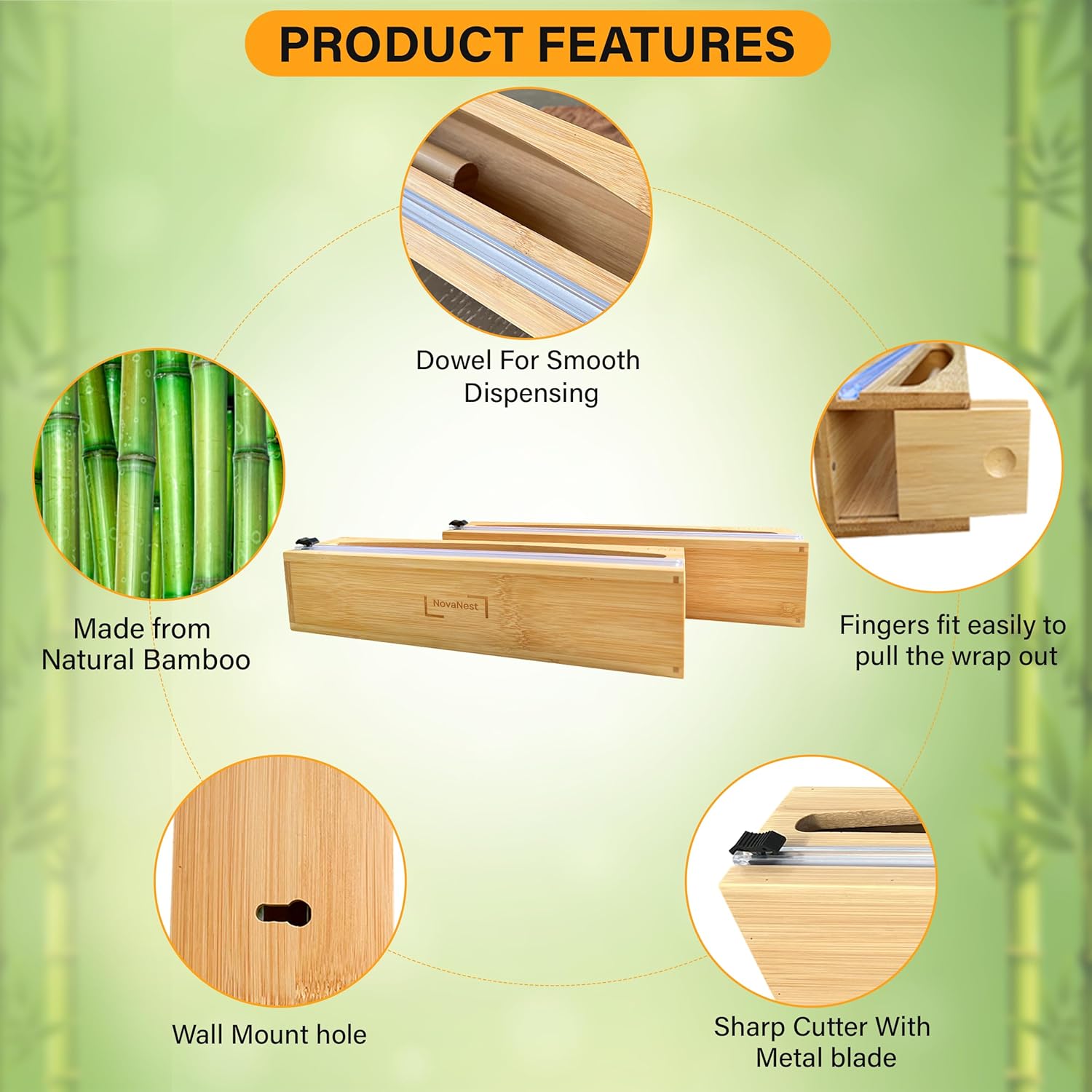 Wrap Organizer Dispenser with Cutter, (2 Piece Set), Fits 12" Rolls, Plastic Wrap, Aluminum Foil, Wax Paper, Saran Wrap, Cling Wrap Holder for Kitchen Storage, Mountable, Bamboo