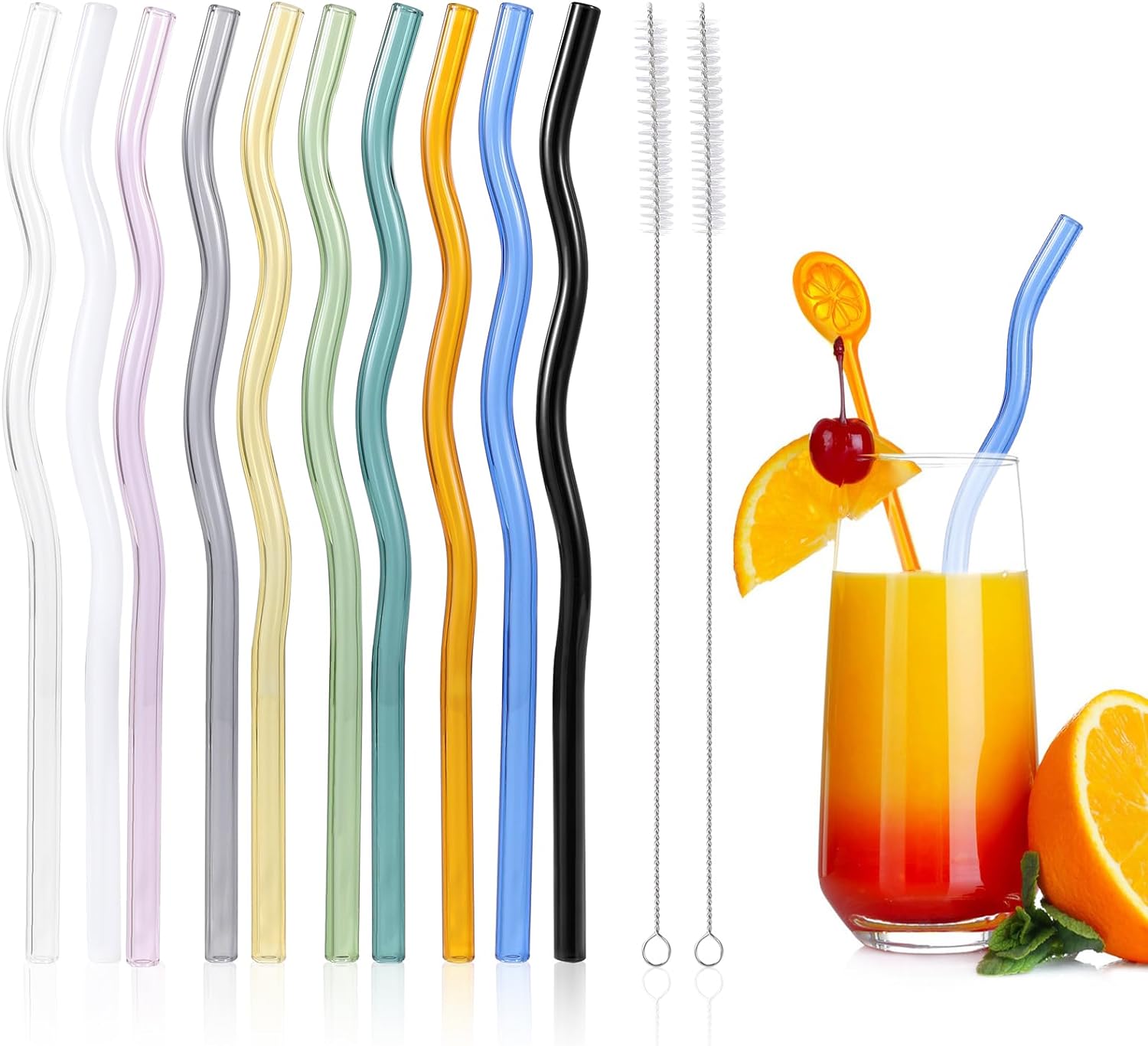 10 Pcs Reusable Wavy Colorful Glass Straws,9''x8 mm Shatter Resistant Cute Drinking Straws with 2 Cleaner Brush for Beverages,Coffee,Juice,Cocktail,Teas