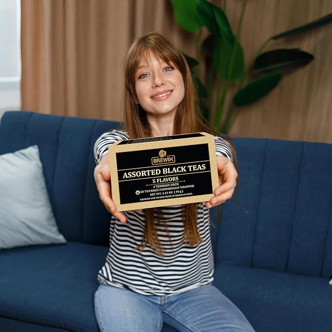 • ASSORTED BLACK TEA GIFT SET - This pack includes 5 different flavors and 4 tea bags each of Earl Grey, English Breakfast, Everyday Assam, Himalayan Breakfast and Golden Summer (Darjeeling). Each of our 20 tea bags variety pack comes in a branded Brewix box making it a perfect caffeinated tea gift set for any tea lover.
