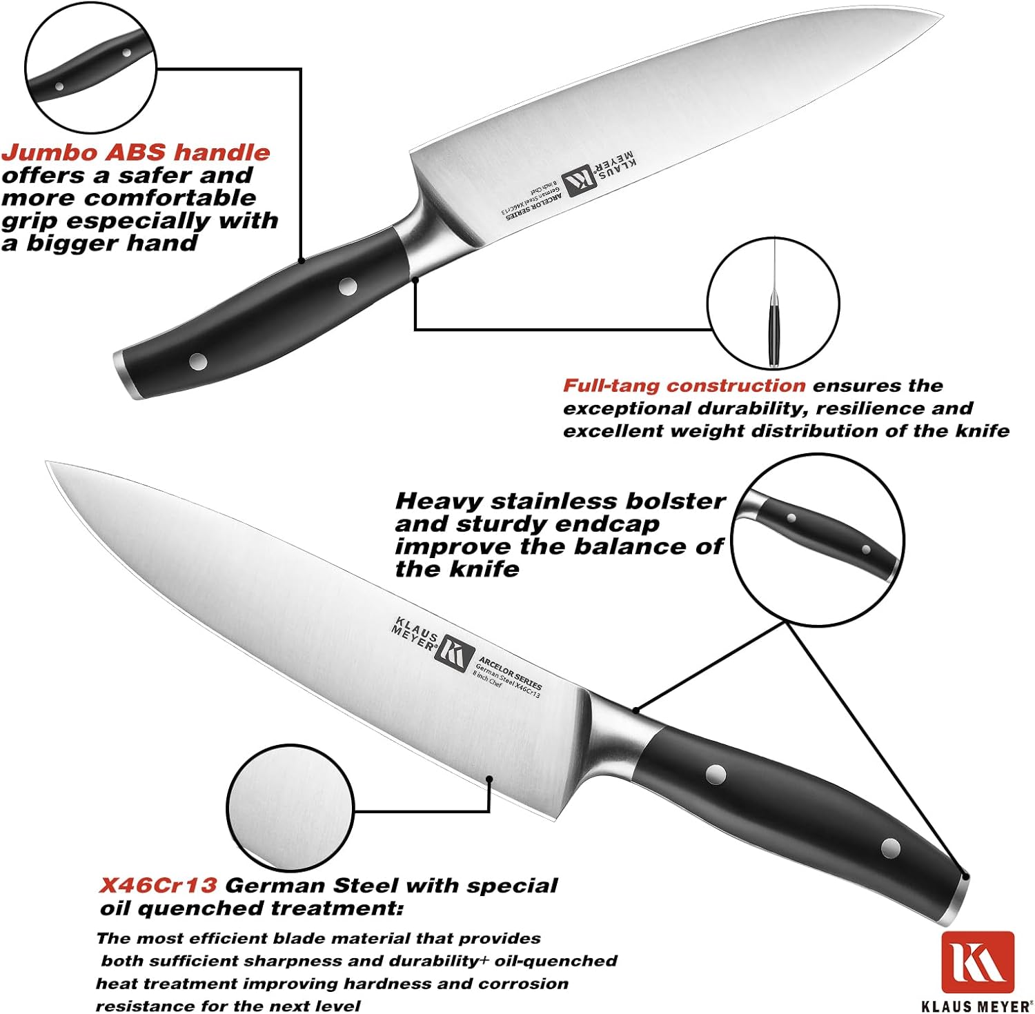 - 【Forged Full-Tang Construction】The knife's full tang construction extends the blade into the handle, enhancing leverage and balance. Its solid, curved bolster provides excellent grip and control, increasing safety and handling precision.