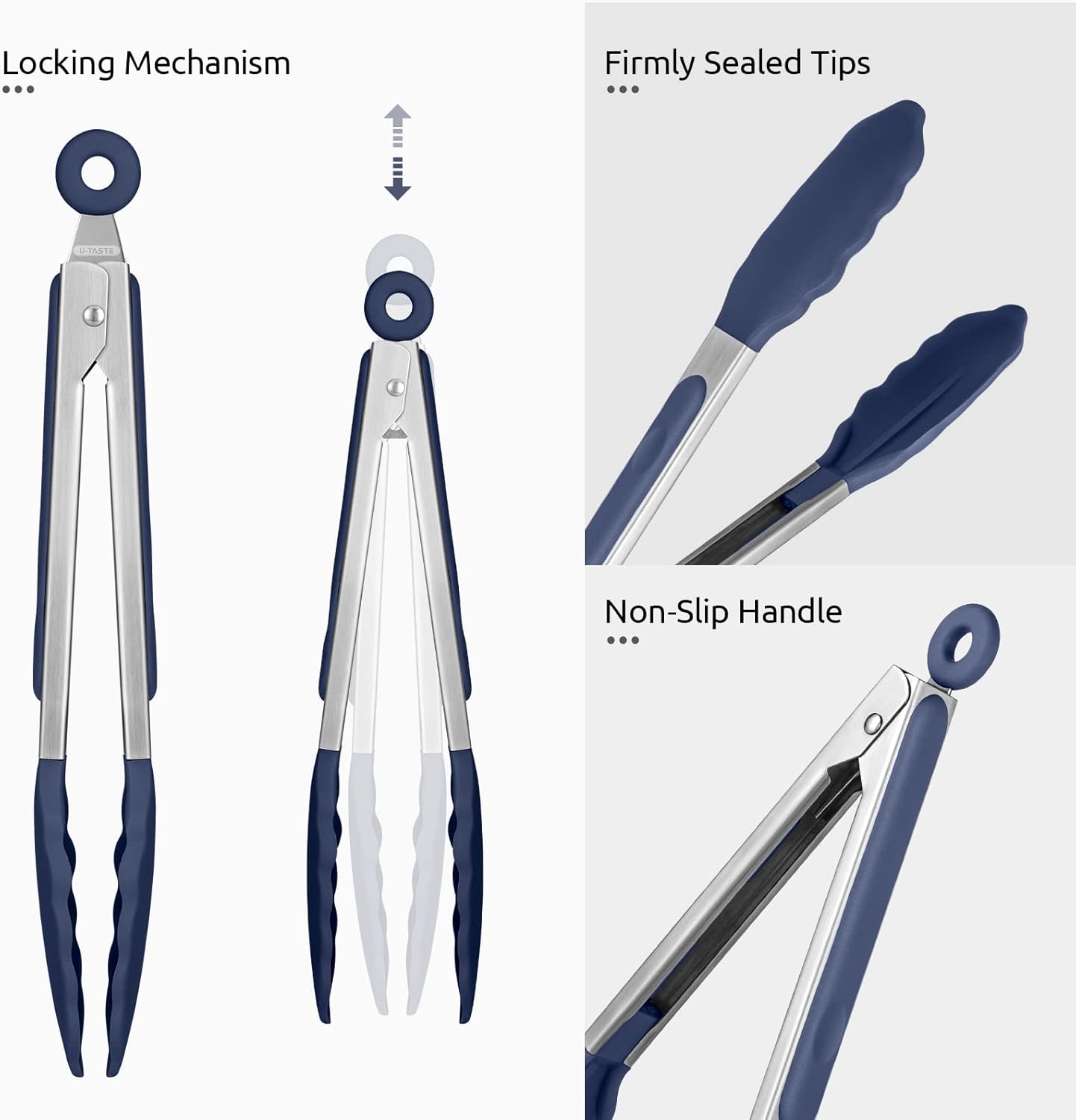 - [18/8 Stainless Steel Handles & Food Grade Silicone] U-Taste kitchen cooking tong set is made of 18/8 stainless steel and food grade silicone. Upgraded 0.8mm thick stainless steel is sturdier and tougher compared to the original version (0.6mm thick). Capable to serve a large piece of food with no sign of shaking or bending. No more strong smell, risk of rusting, deformation or any other problems like chipping off. Handles coated with Food Grade silicone provide a comfortable and not slip grip.