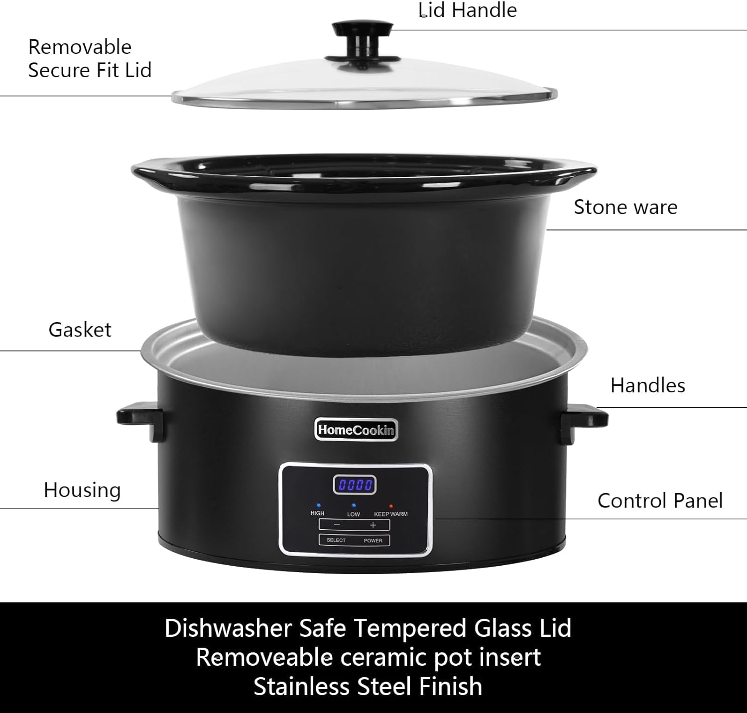 HOMECOOKIN 6 Quart Programmable Slow Cooker, Kitchen Appliances, Perfect Kitchen Small Appliance for Family Dinners, Black Stainless Steel