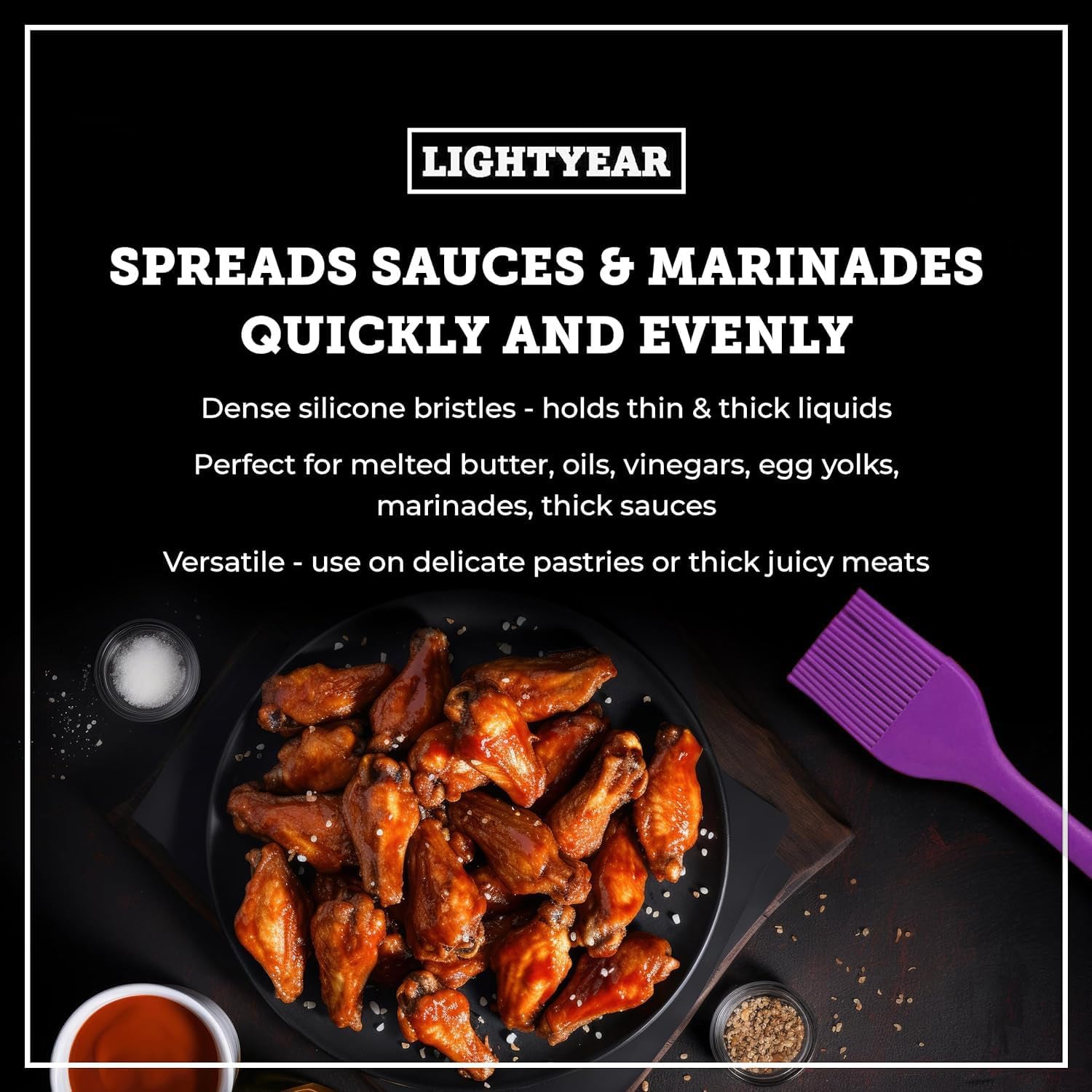 - [ SPREADS SAUCES AND MARINADES QUICKLY AND EVENLY ] Lightyear’s dense silicone bristles absorb both thick and thin liquids for more effective basting. This means you get an even spread of your marinade, ensuring that every inch of your food is infused with flavour. Perfect for melted butter, oils, vinegars, egg yolks, and juicy meat marinade.