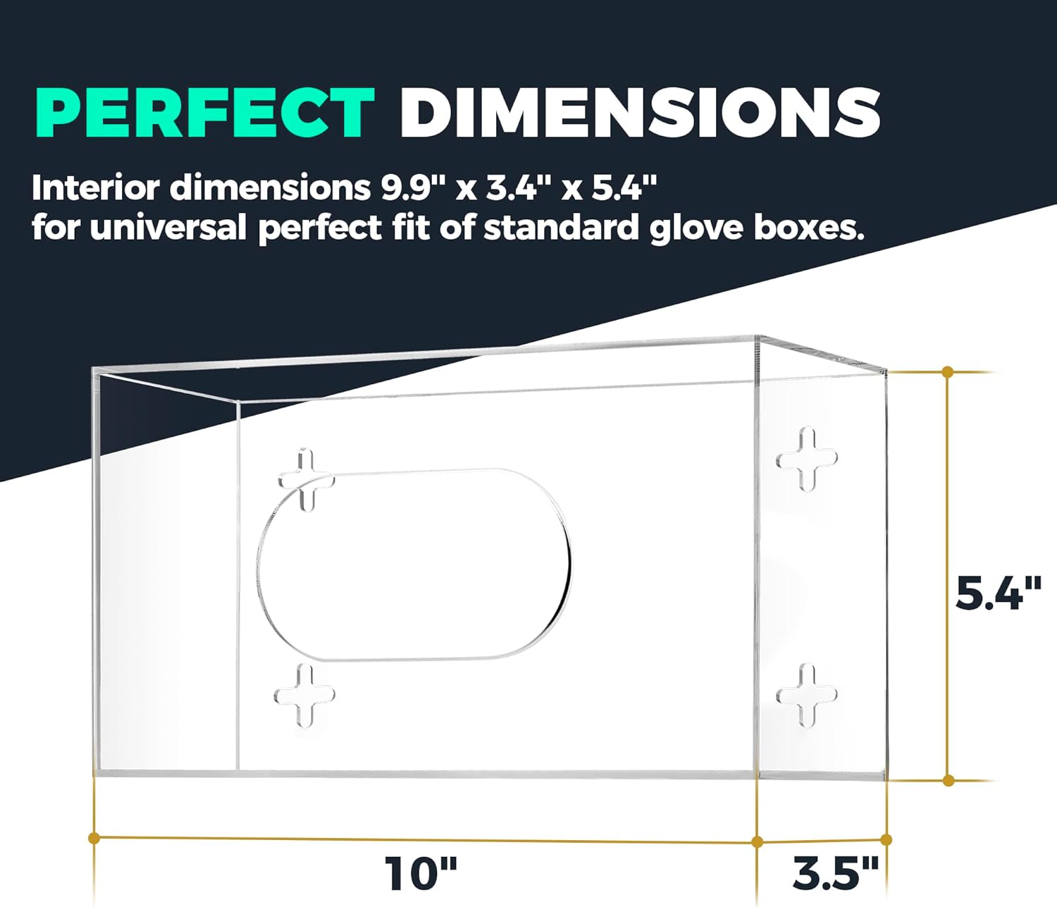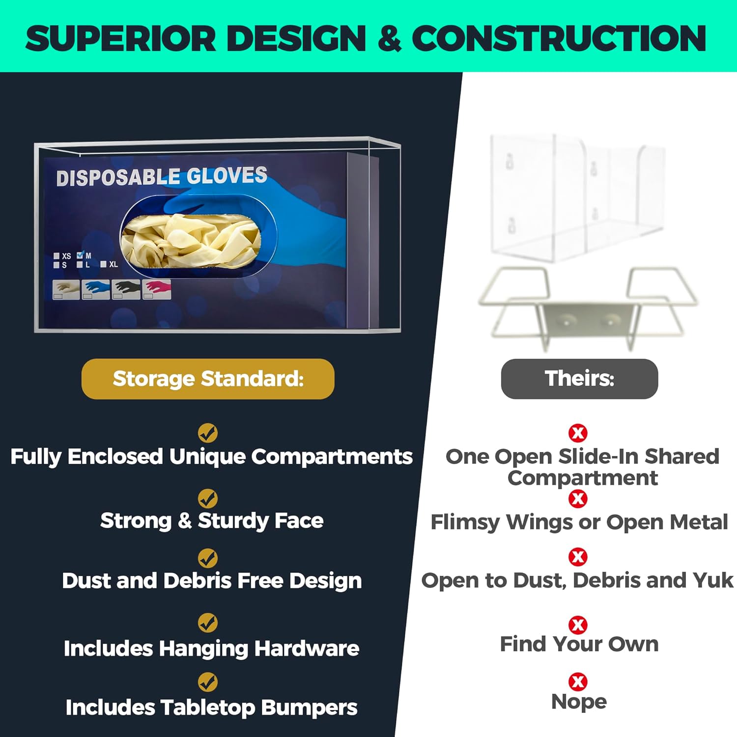 - Universal Compartment Size for Standard Glove Box - Our disposable gloves dispenser has a standard size compartment to let you store any preferred gloves. Our latex glove dispenser wall mount rubber glove holder is sized to fit standard glove boxes.