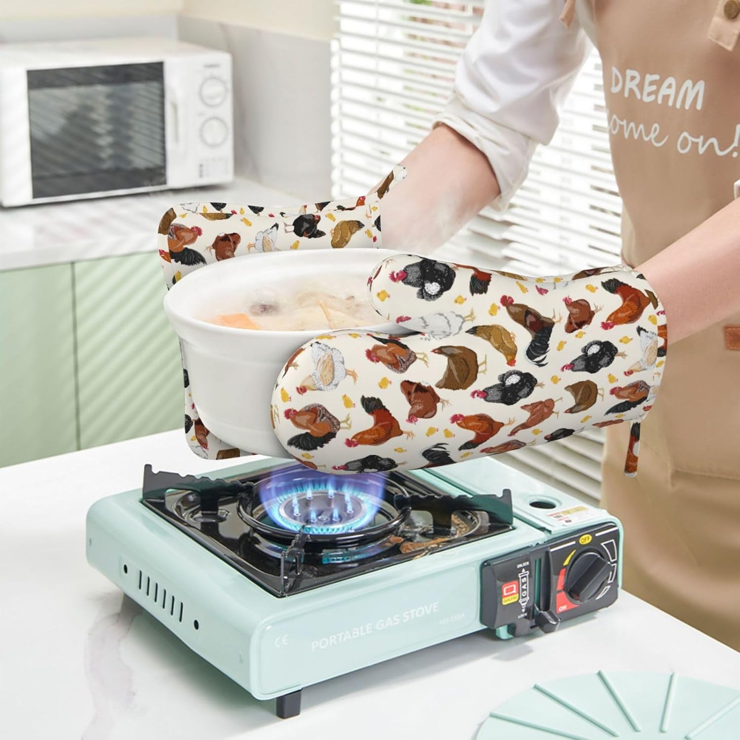 Rooster Hen Oven Mitts and Pot Holders Sets Silicone Rustic Domestic Animal Chicken Kitchen Mitts Potholders Heat Resistant 4Pcs Oven Gloves Hot Pads for Kitchen Baking Cooking BBQ Grilling
