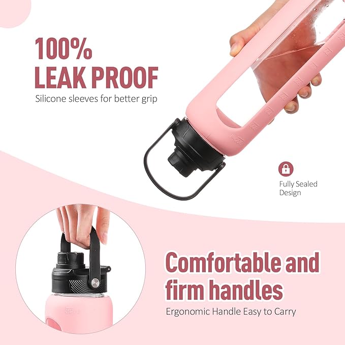 • 24 OZ AND 32 OZ VOLUME FOR OPTIONS - We have 2 sizes for those glass drinking bottles. The 32 oz glass water bottles are perfect for those who require a larger volume of water throughout the day. With this 32 oz bottle(1 liter water bottle), you can stay hydrated without the need for frequent refills. For those seeking a slightly smaller option, we offer the 24 oz glass water bottle, which is ideal for individuals who prefer a more compact and lightweight bottle.