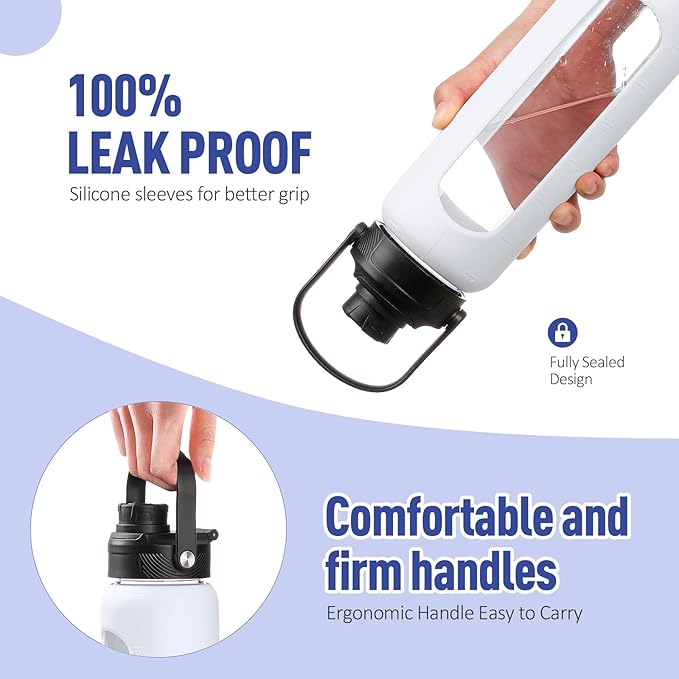 • 24 OZ AND 32 OZ VOLUME FOR OPTIONS - We have 2 sizes for those glass drinking bottles. The 32 oz glass water bottles are perfect for those who require a larger volume of water throughout the day. With this 32 oz bottle(1 liter water bottle), you can stay hydrated without the need for frequent refills. For those seeking a slightly smaller option, we offer the 24 oz glass water bottle, which is ideal for individuals who prefer a more compact and lightweight bottle.