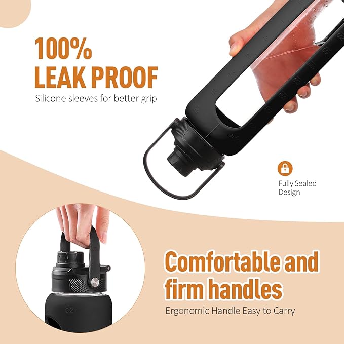 • 24 OZ AND 32 OZ VOLUME FOR OPTIONS - We have 2 sizes for those glass drinking bottles. The 32 oz glass water bottles are perfect for those who require a larger volume of water throughout the day. With this 32 oz bottle(1 liter water bottle), you can stay hydrated without the need for frequent refills. For those seeking a slightly smaller option, we offer the 24 oz glass water bottle, which is ideal for individuals who prefer a more compact and lightweight bottle.