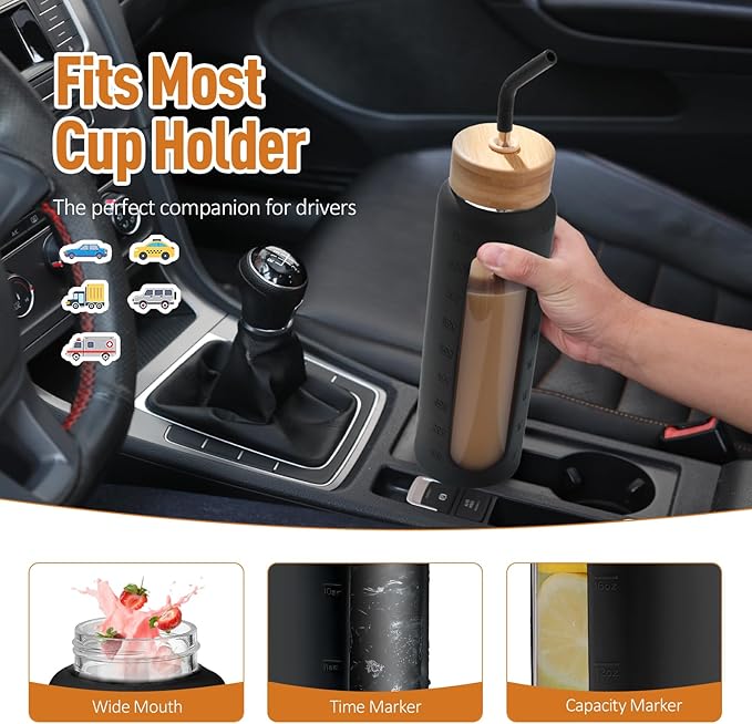 • WATER BOTTLE WITH TIME MARKER - The sleek, modern design coupled with the protective silicone cover makes our Kodrine glass water bottle a fashionable and functional accessory for any setting. The time marker and capacity marker on the sleeve are designed to help you stay hydrated and track your water intake throughout the day. The transparent body allows you to see the liquid level inside the bottle clearly, making it easy to stay on track with your hydration routine.